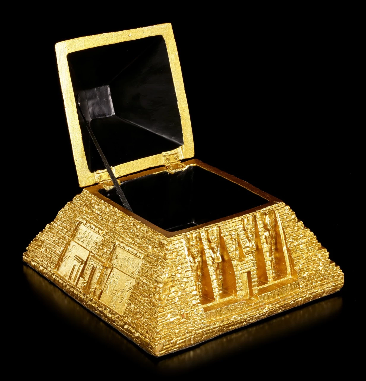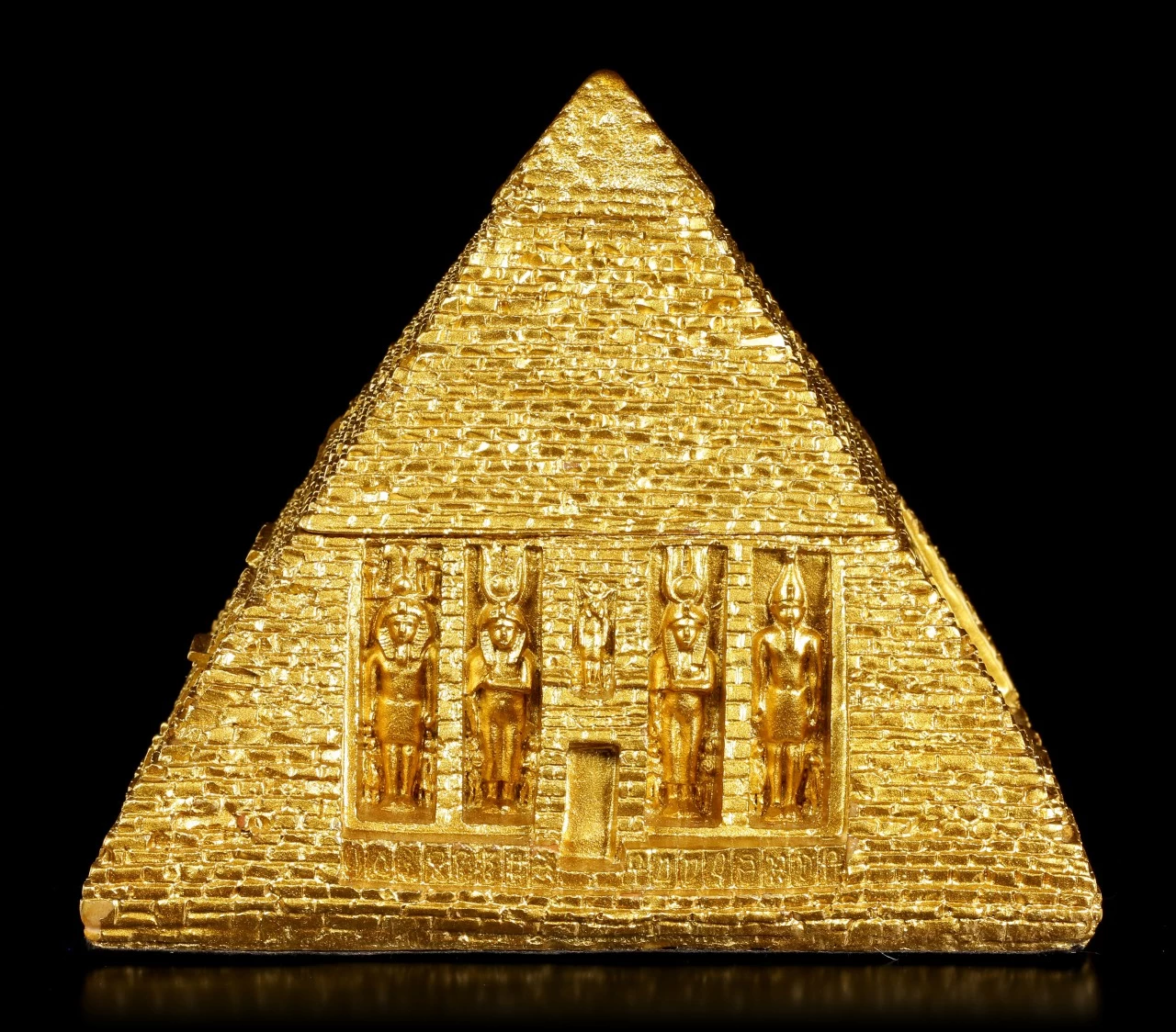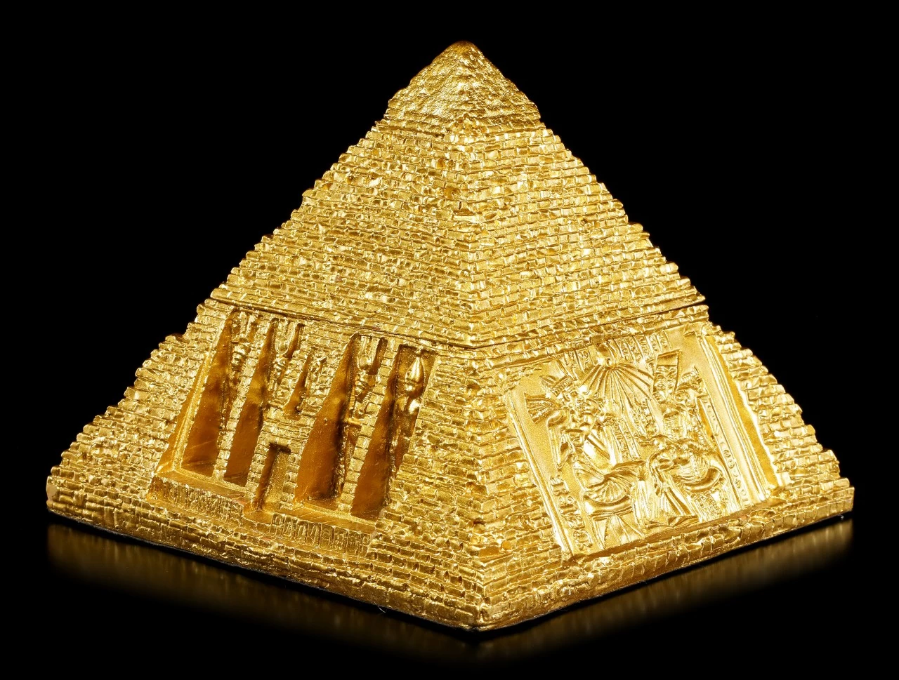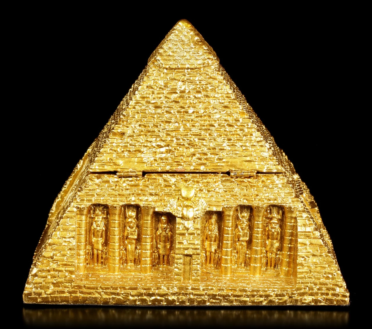 Diese goldene Schatulle in Form einer ägyptischen Pyramide bringt ägyptisches Flair in Ihre Wohnung. Die Schatulle wurde liebevoll bis ins kleinste Detail ausgearbeitet und wird zu einem schönen Blickfang auf einem Tisch oder in einem Regal.
