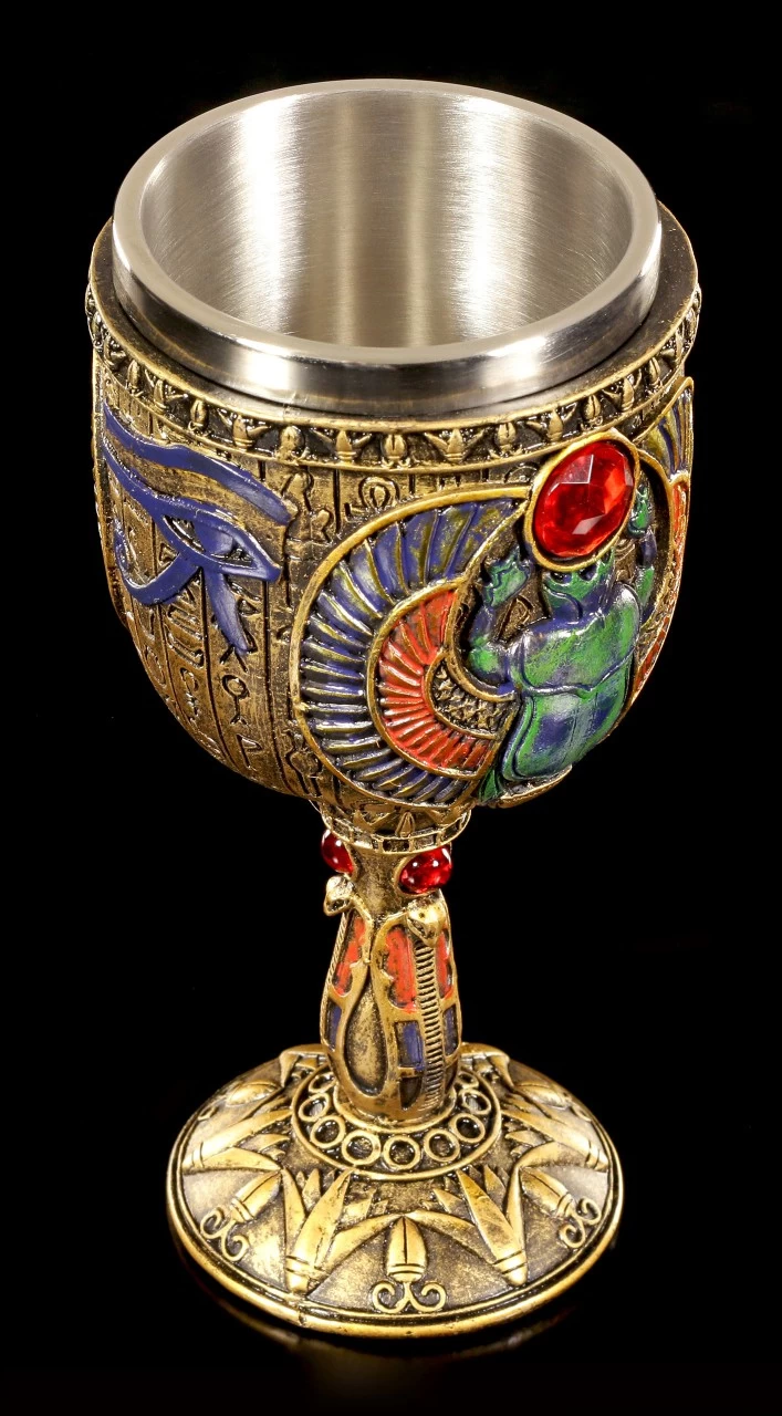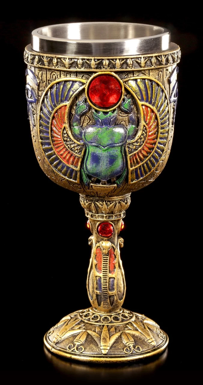 Im alten Ägypten stand der Skarabäus für Befruchtung und Wiedergeburt. Dieser detailreiche, handbemalte Kelch besticht durch den farbigen Skarabäus sowie die unzähligen Hieroglyphen.