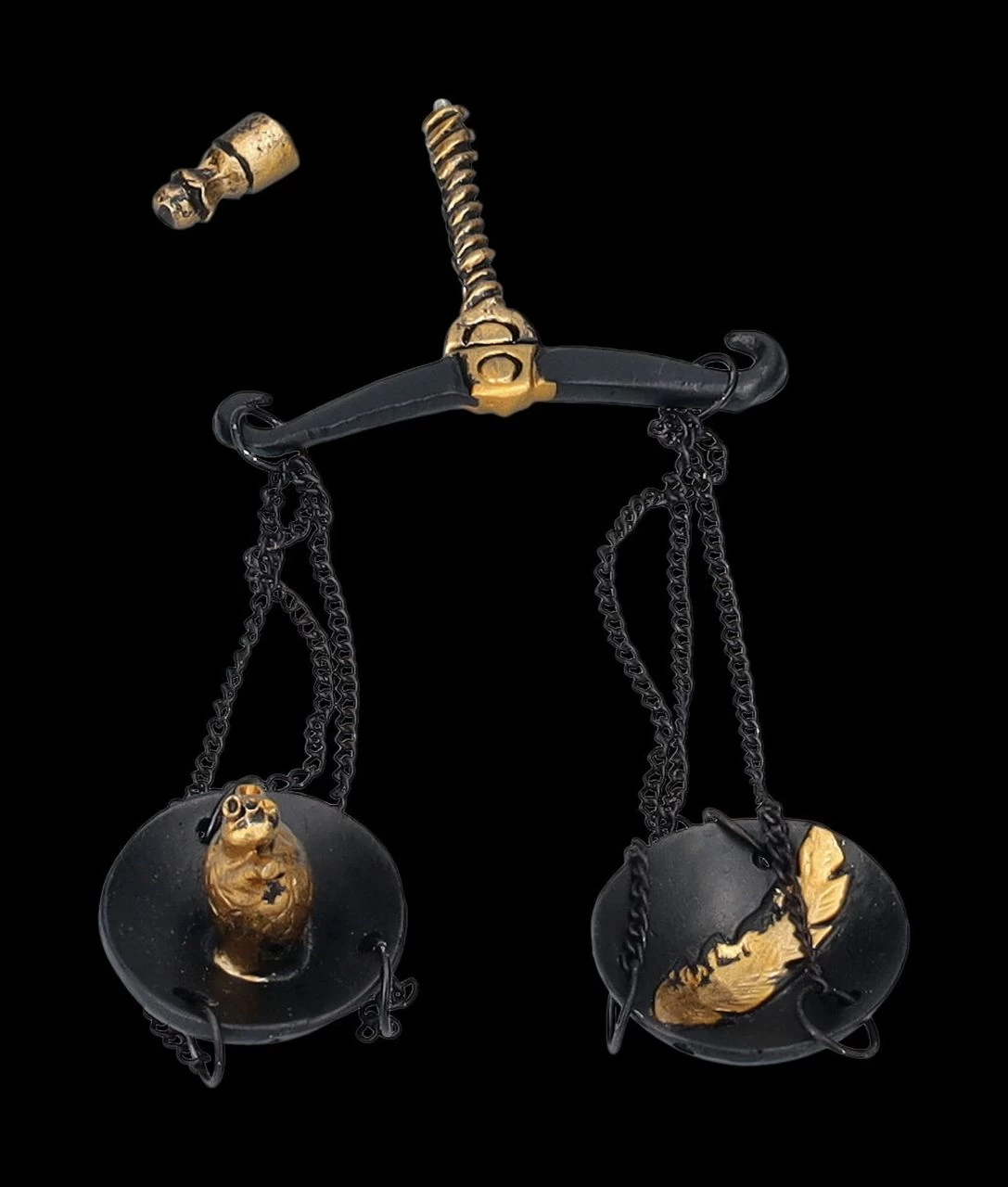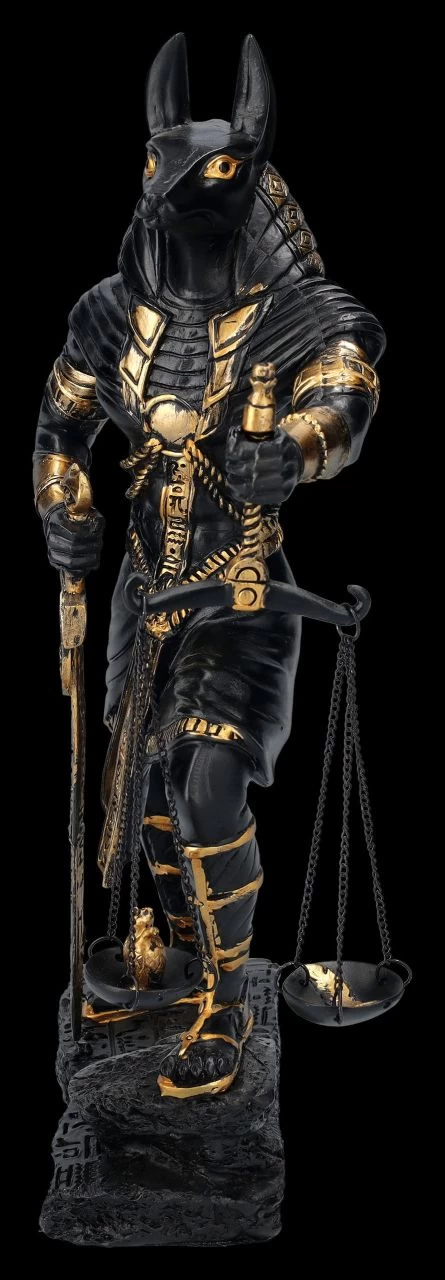 In der altägyptischen Mythologie wurde Anubis als Gott der Totenriten und Einbalsamierung verehrt. Eine der wichtigsten Aufgaben des schakalköpfigen Gottes war die Überwachung des Wiegens der Seele und sein Urteil war dabei von entscheidender Bedeutung. Diese schöne 26 cm hohe, 7 cm breite und 15 cm tiefe Figur zeigt Anubis mit der Waage in der linken Hand, während seine rechte Hand auf dem Schwert ruht. Anubis scheint kurz davor zu sein, das Urteil über den Toten zu fällen. Die schwarze Anubis-Figur mit derr Waage wurde mjit bronzefarbenen Akzenten aus handbemaltem Kunststein (Polyresin) gefertigt und ist auch ein wunderbares Geschenk für jeden, der sich für die altägyptische Geschichte interessiert. Die Waage ist zum Schrauben.