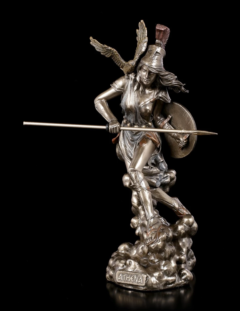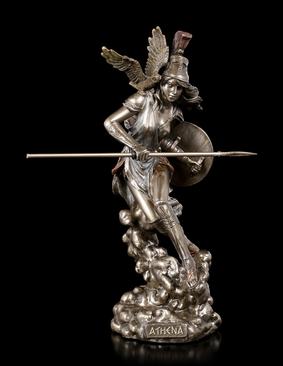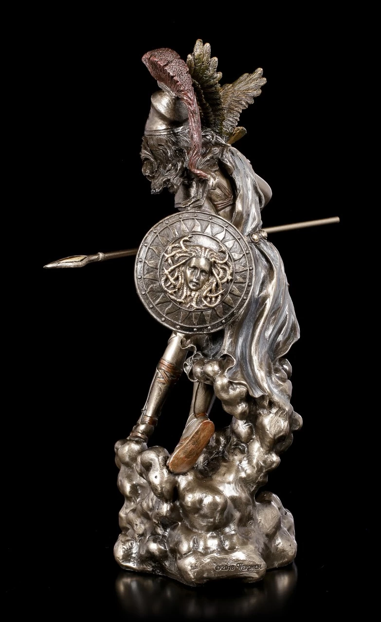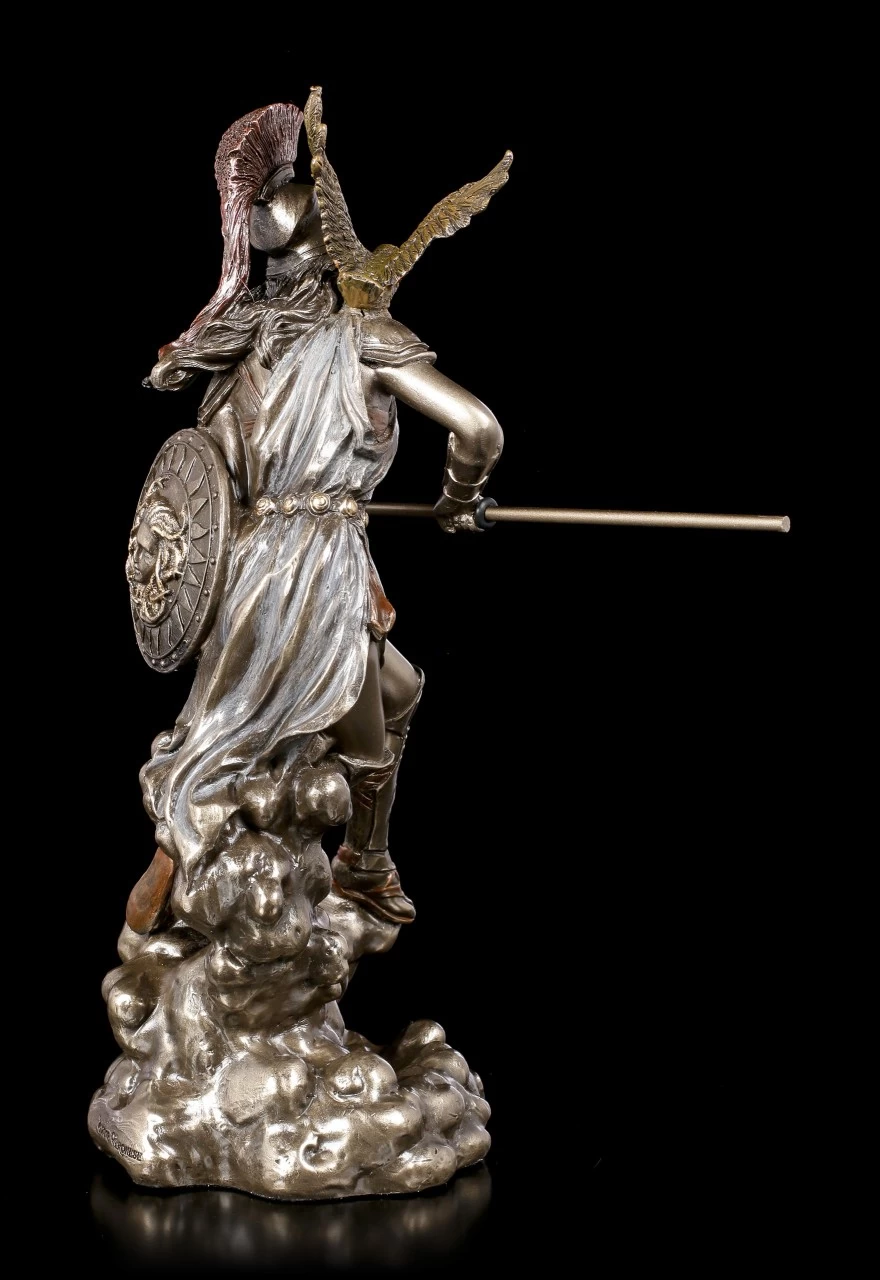 Aus dem Hause Veronese stammt diese dynamische Athena mit Eule, Schild und Speer. Die edel bronzierte Götter Figur aus Kunststein (Polyresin) besticht durch die vielen Details und die leichte Coloration diverser Details. Die Göttin scheint mitten in der Bewegung eingefroren zu sein.