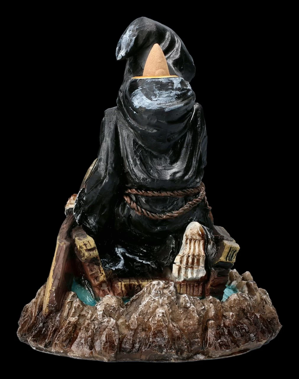 In seinem Fährboot überquert bei diesem faszinierendem Backflow Räucherhalter der düstere Fährmann Charon als Reaper den Styx. Nur wer den Obolus entrichten kann, wird über den Fluß der Unterwelt gebracht. Der mystische Backflow Räucherhalter mit der Höhe von 16 cm, der Breite von 14 cm und der Tiefe von 16,5 cm ist aus handbemaltem Kunststein (Polyresin) gefertigt. Ein Backflow Räucherkegel wird mitgeliefert, weitere finden Sie in unserem Shop. Bitte beachten Sie unbedingt unsere Sicherheitshinweise.