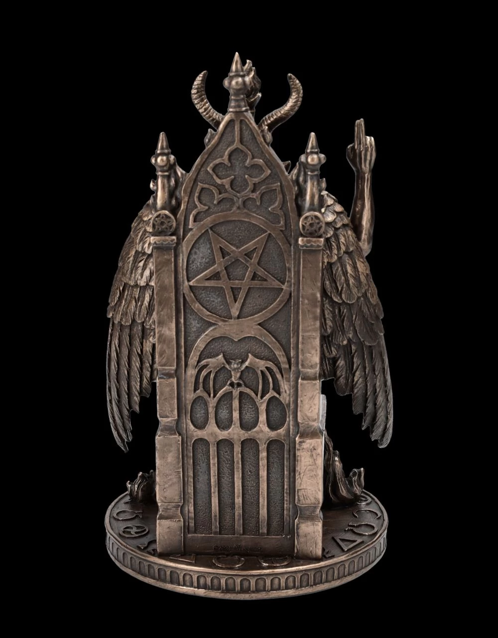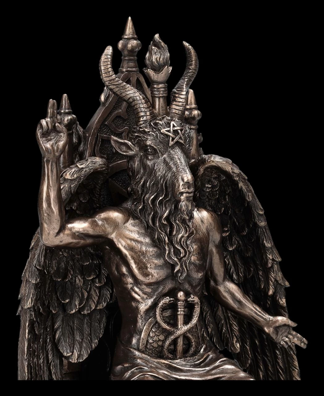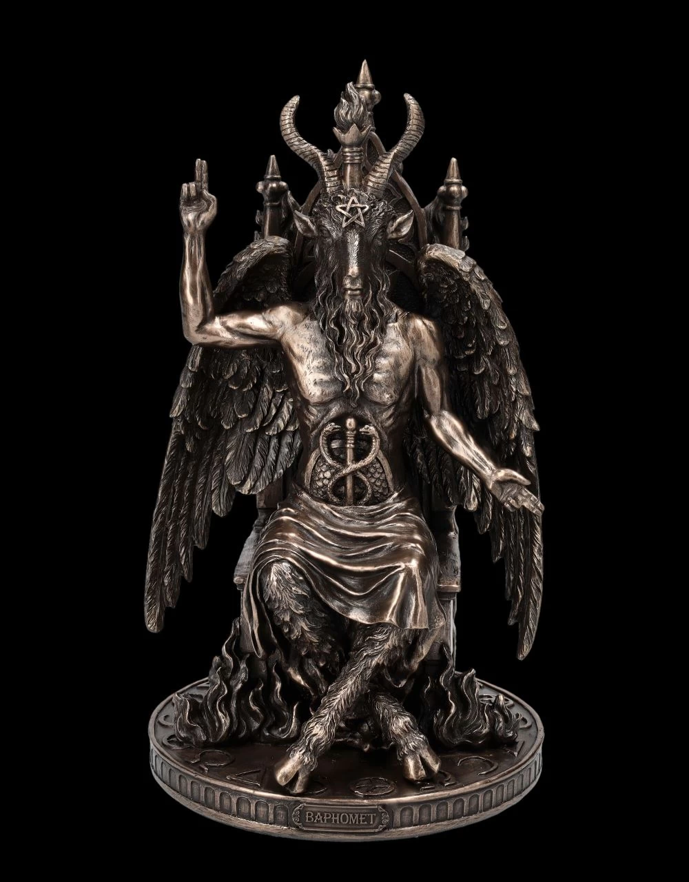 Baphomet, der gefallene Engel mit dem Ziegenkopf, den Pferdehufen und den großen Flügeln sitzt majestätisch auf seinem Thron. Einst von den Templern und Freimaurern als Sinnbild für ‚Gut und Böse‘ verehrt, hat Baphomet, vor allem auch mit dem Pentagramm als mächtiges Schutzsymbol, mittlerweile viele Anhänger. Heute wird er zwar von vielen als Symbol des Satans gesehen, andere sehen in ihm jedoch eine Gottheit und eine Möglichkeit für eine spirituelle Entwicklung. Baphomet vereint die Gegensätze wie ‚Engel und Teufel‘, ‚Gut und Böse‘, ‚Tier und Mensch‘, ‚Mann und Frau‘. Die sehr archaisch, aber auch edel wirkende Skulptur des Baphomet auf dem Thron aus hochwertigem Kunststein (Polyresin) stammt aus der Studio Collection von Veronese. Die 24 cm hohe, 14 cm breite und 14 cm tiefe edel bronzierte Figur hat in der detaillierten Darstellung eine außerordentlich große Wirkung. Diese Skulptur des Baphomet auf dem Thron wird garantiert überall zum sofortigen Blickfang.