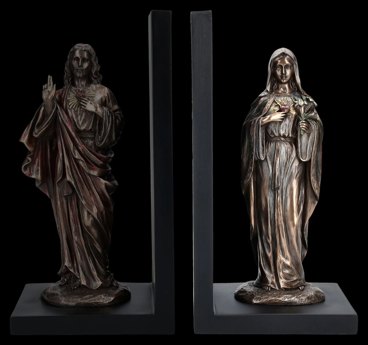 Mit der rechten Hand zeigt diese wunderschöne Marien-Figur auf ihr Herz und in der linken hält sie als Zeichen der Reinheit eine Lilie. Diese liebevoll gearbeitete Figur der Madonna kann alle Bücher die einem am Herzen liegen, aber natürlich auch alle mit religiösen oder anderen wichtigen Themen, perfekt stützen. Die außergewöhnliche, 23,5 cm hohe, 12 cm breite und 10,5 cm tiefe Buchstütze aus der Studio Collection von Veronese ist sehr stilvoll und detailreich aus edel bronziertem und fein coloriertem Kunststein (Polyresin) gefertigt. Die Buchstütze mit der Figur der Maria ist nicht nur eine wunderbare Deko für das Bücherregal, sondern passt auch hervorragend zur Buchstütze mit der schönen Jesus-Figur aus unserem Shop. Die Buchstütze ist – vielleicht auch gleich mit dem passenden Buch – ein wunderbares Geschenk. Die Jesus-Figur als Pendant zur Buchstütze mit der Marien-Figur und die Deko sind nicht in der Lieferung enthalten.