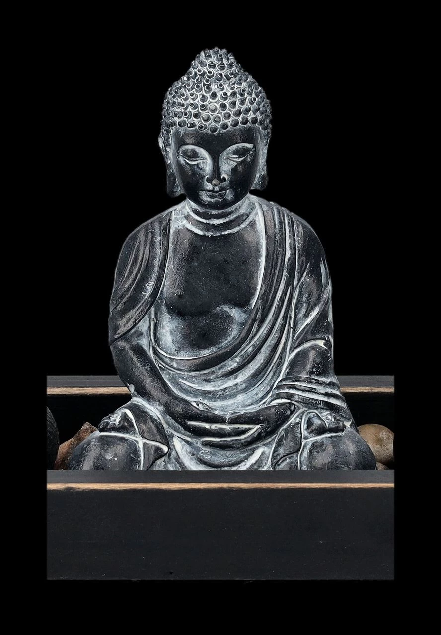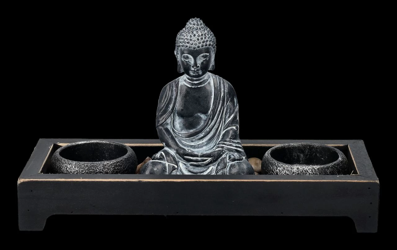 Aus handbemaltem Kunststein (Polyresin) gefertigt, sitzt der 10 cm hohe, 7 cm breite und 5 cm tiefes schwarze Buddha zwischen zwei Teelichthaltern in dem Zen Garten aus Holz. Mit den Steinen vermittelt das insgesamt 12 cm hohe, 20 cm breite und 8 cm tiefe Zen Garten-Set Ihrem Zuhause einen meditativ ruhigen Eindruck.