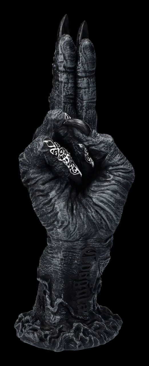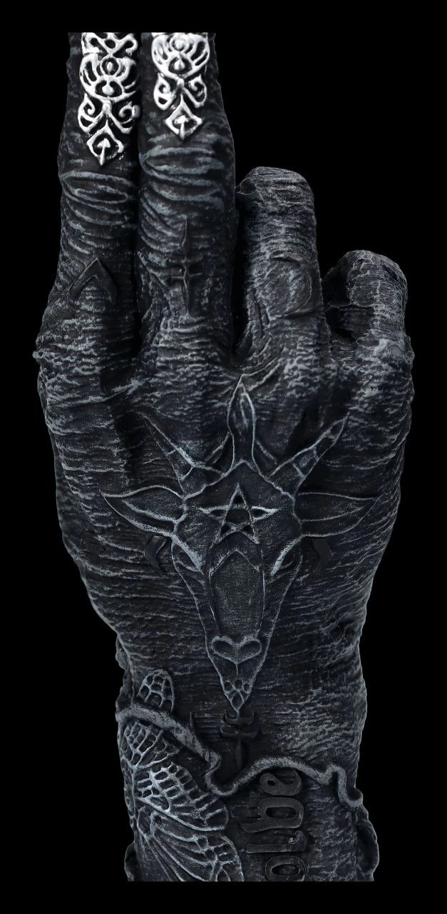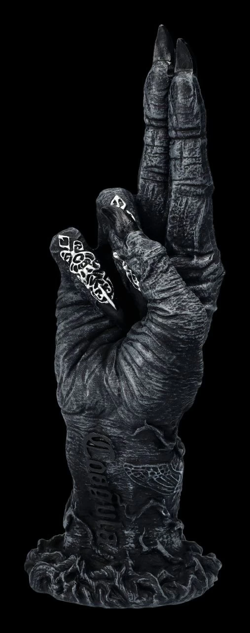 Mit zwei Fingern zeigt bei dieser ungewöhnlichen, 19 cm hohen, 6,5 cm breiten und 6,5 cm tiefen Skulptur Baphomet’s Hand wie aus dem Nichts kommend zum Himmel. ‚Solve‘ und ‚Coagula‘. – also ‚Löse‘ und ‚Verbinde‘ ist auf dem Handgelenk zu lesen. Die wie bereits verfallen aussehende faltige Hand, auf der lediglich der Schmuck silbern glänzt, wurde sorgfältig aus handbemaltem Kunststein (Polyresin) gefertigt. Sie kommt inklusive einer toll bedruckten Geschenkverpackung und passt perfekt in jede Gothic-Sammlung.