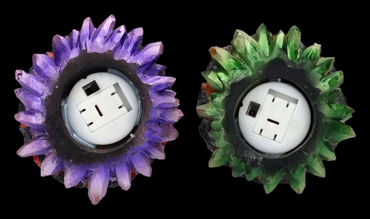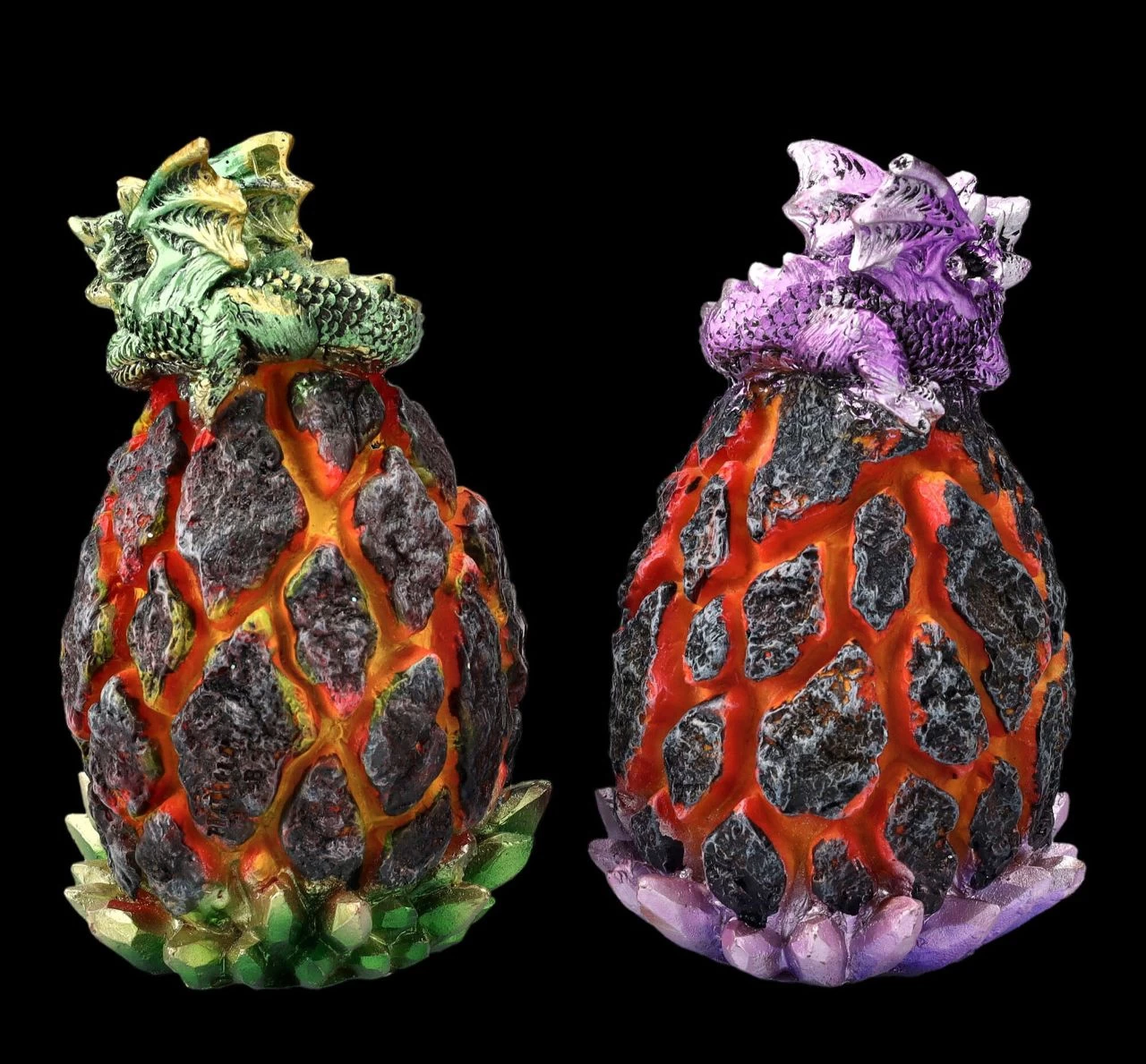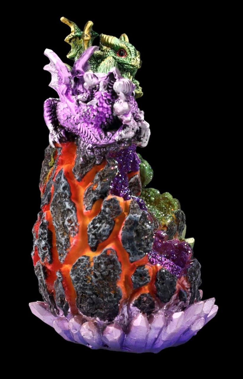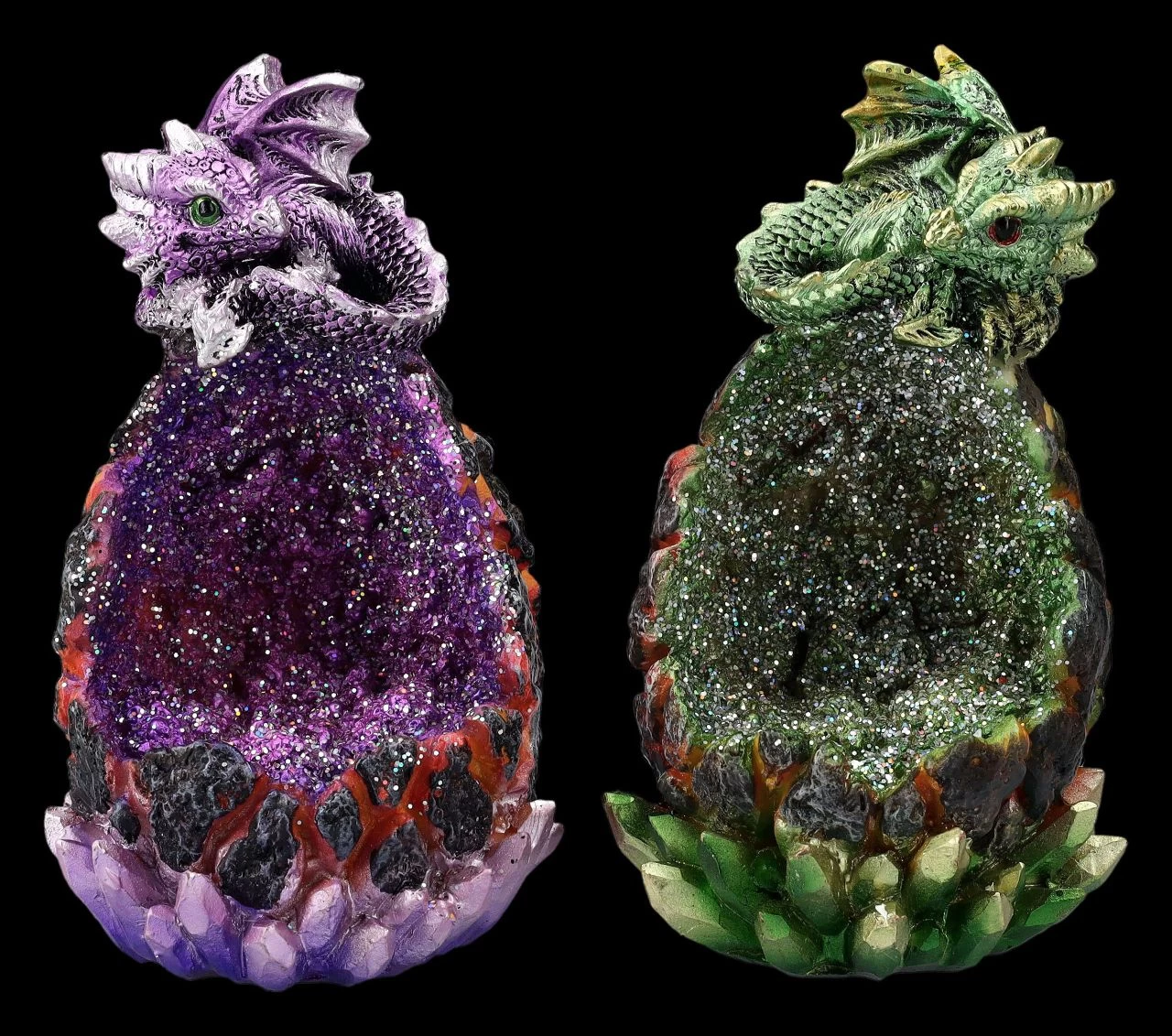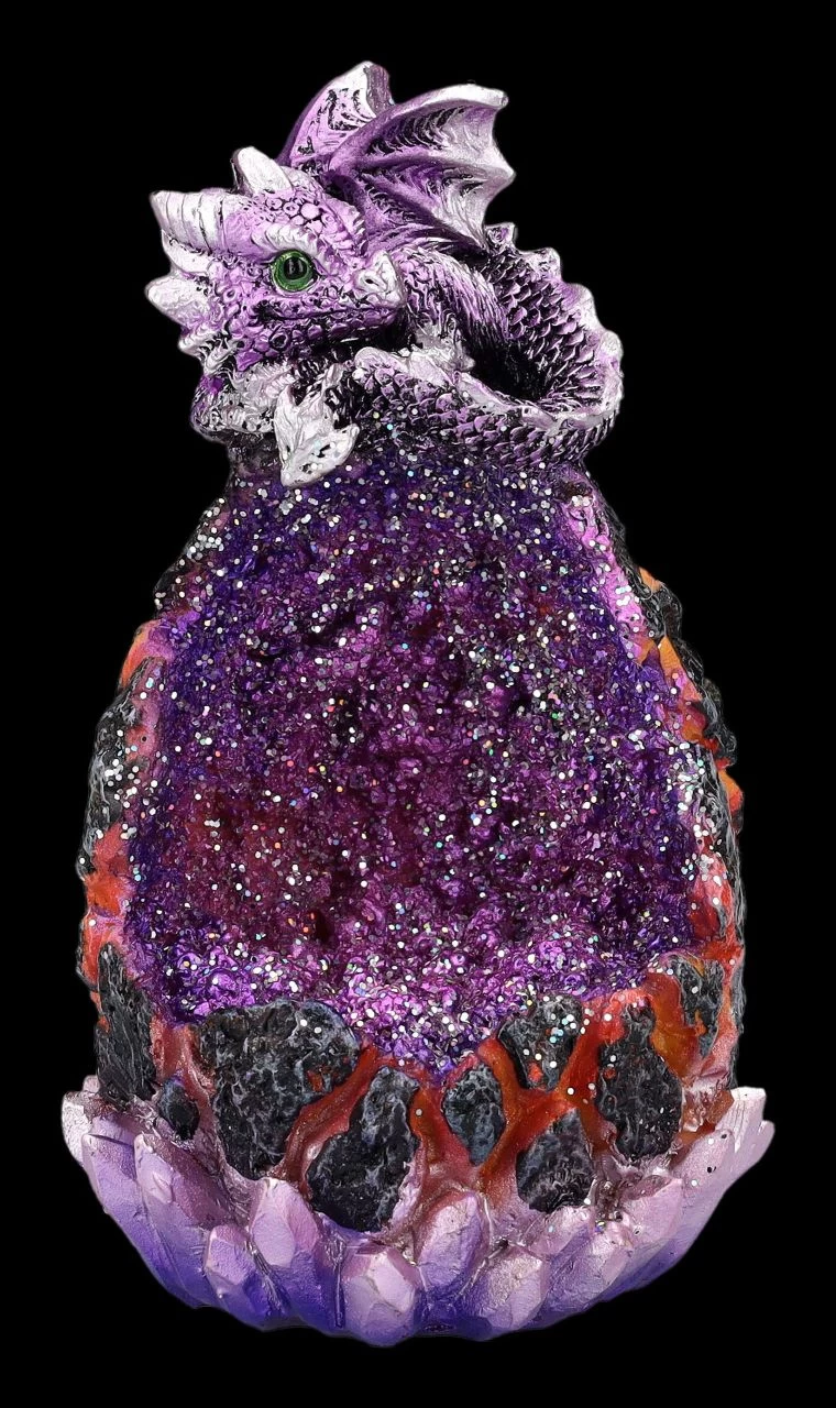 Ob an Weihnachten, an Ostern – oder wann auch immer- diese bunten leuchtenden Eier sind immer eine wunderbar magische Dekoration. Die beiden violetten und das grünen Eier sehen aus wie aus einem Kristall entstanden. Wenn die LED-Beleuchtung mit Farbwechsler eingeschaltet ist, wirkt es, als wäre die Schale gerade aufgebrochen und die beiden niedlichen auf den Eiern sitzenden Drachen wären gerade geschlüpft. Die beiden Eier mit den Drachenbabys kommen im 2er Set und wurden detailreich aus liebevoll handbemaltem Kunststein (Polyresin) gefertigt. Sie sind je 13,5 cm hoch, je 8 cm breit und je 8,5 cm tief. Für die LED-Beleuchtung werden je 2 x LR44 Batterien benötigt, die nicht in der Lieferung enthalten sind. Für Drachenfreunde und Drachensammler sind diese beiden Babys auf den Eiern ein wunderbares Geschenk.