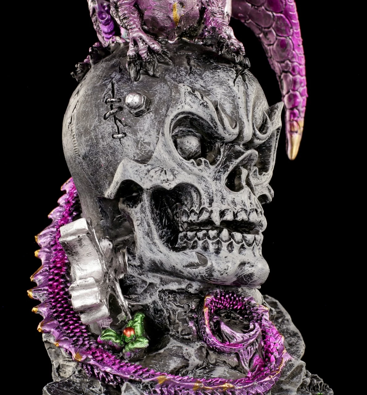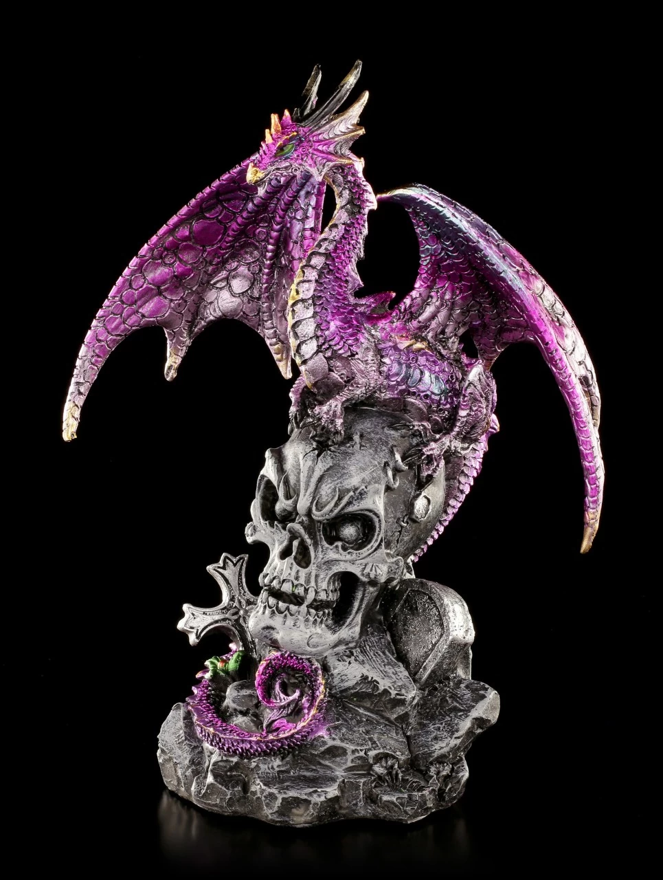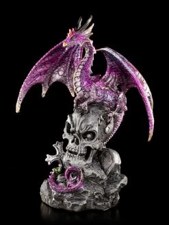 Detailreiche handbemalte Kunststein Drachen Figur mit Totenkopf. Der pinkfarbene Drache steht im perfekten Kontrast zum grau-schwarzen Totenschädel. Vervollständigen Sie Ihre Sammlung mit dieser tollen Figur.