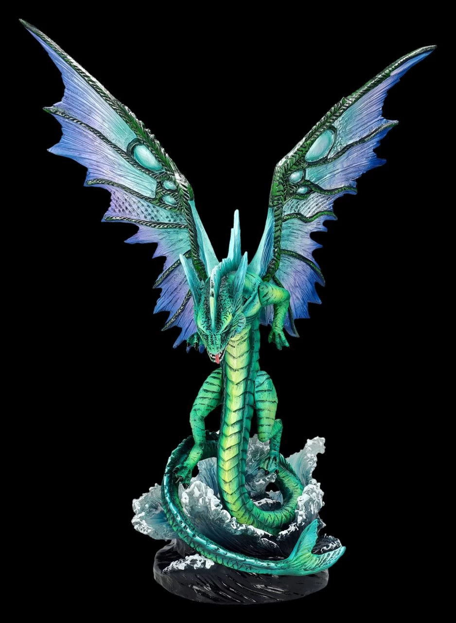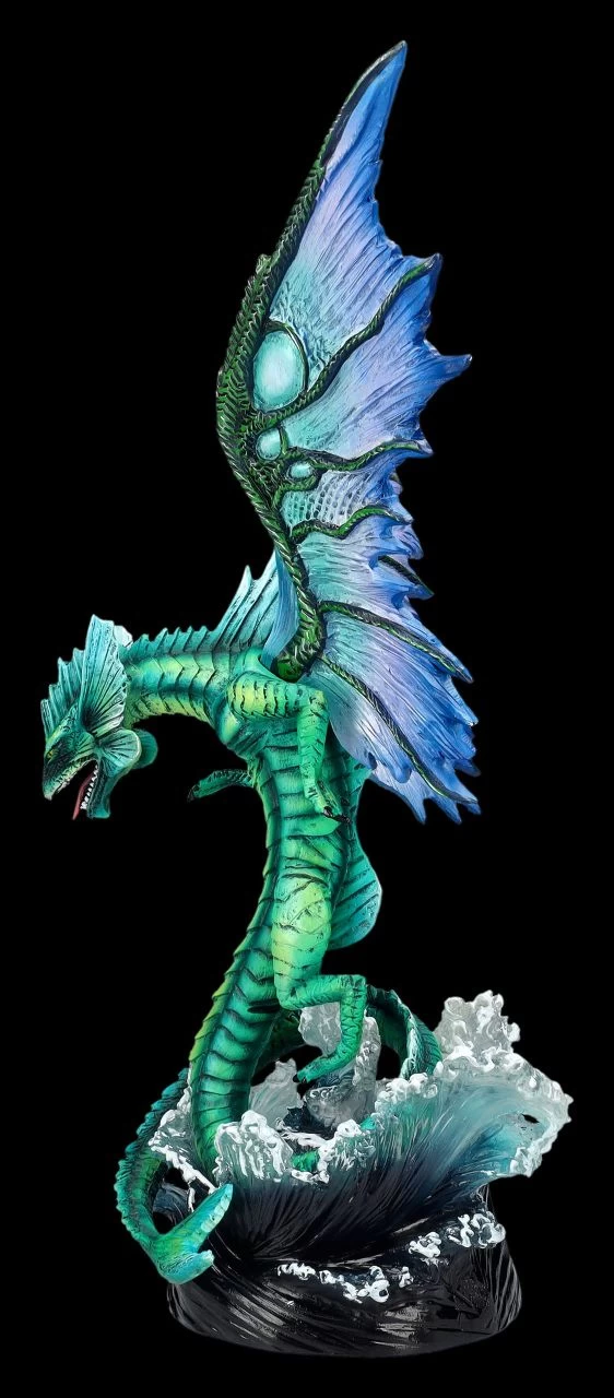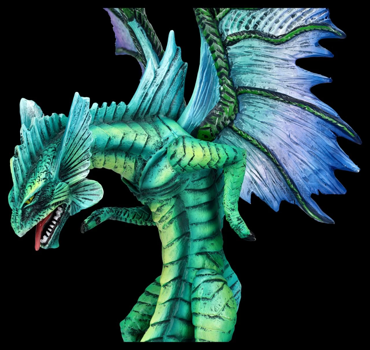 Die großen blau-grünen Flügel, die beinahe wie zarte Schmetterlingsflügel aussehen, weit ausgebreitet, erhebt sich der grüne Wasserdrache angriffslustig hoch über die von seinem Schwanz aufgepeitschte Wasseroberfläche. Selbst in der verborgenen und geheimnisvollen Welt der Drachen, Einhörner, Elfen und Feen ist dieser Wasserdrache ein beeindruckendes Wesen, das von vielen gefürchtet wird. Der prächtige, 38 cm hohe, 23 cm breite und 15 cm tiefe grün-blaue Wasserdrache ist fantastisch detailreich aus hochwertigem Kunststein (Polyresin) entstanden und wurde mit viel Liebe zum Detail sorgfältig von Hand bemalt. Die schönen und eher filigranen Flügel sind zum Stecken. Der prachtvolle Drache wird in jedem Raum zum effektvollen Blickfang der jeden beeindrucken wird. Für alle, die von der Welt der geheimnisvollen Wesen begeistert sind, aber natürlich auch für alle, die das Element ‚Wasser‘ in ihrem Geburtshoroskop haben, ist die prächtige Drachen-Figur ein perfektes Geschenk.