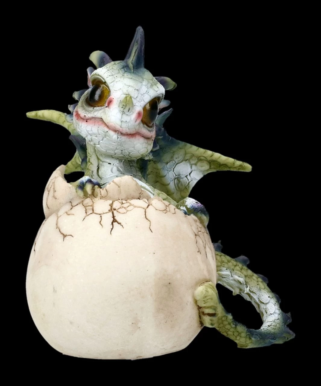 Diese Figur vielleicht? Ich bin schon groß, wer fürchtet mich? Neckisch schaut das Drachenbaby Taby aus dem Ei hervor. Das süße, gerade aus seinem Ei schlüpfende Drachenmädel, schaut so lieb drein, dass sich bestimmt niemand fürchtet…. Es ist aus liebevoll handbemaltem Kunststein (Polyresin) gefertigt und 10 cm hoch, 9 cm breit und 11 cm tief. Die putzige Hatchlings Emergence Taby ist ein wirklich tolles Geschenk für alle Drachensammler. Weitere, gerade aus dem Ei schlüpfende Babydrachen warten übrigens in unserem Shop auf ihre Drachen-Freunde.