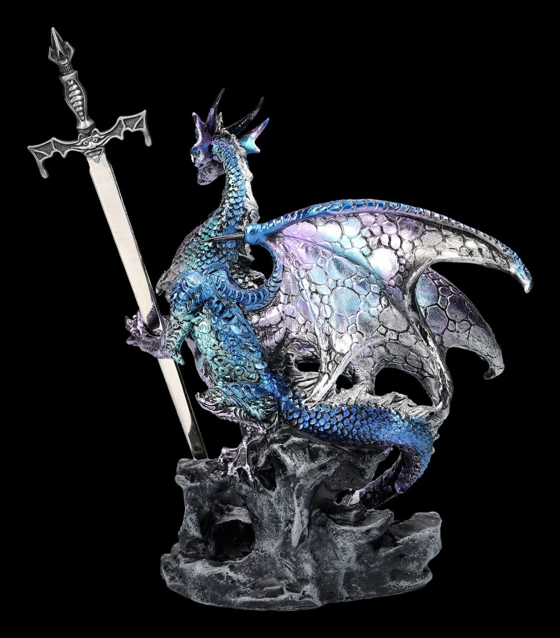 Sword of the Dragon ist ein fantasievolles Accessoire für jeden Schreibtisch. Der prachtvolle Drache, der hoch aufgerichtet einen 21 cm langen Brieföffner aus Metall in Form eines Schwertes in seinen Krallen hält, wurde sehr detailreich aus Kunststein (Polyresin) gefertigt und von Hand bemalt. Der 22,5 cm hohe, 18,5 cm breite und 11,5 cm tiefe Drache mit dem Brieföffner ist aber auch ein außergewöhnliches Geschenk, das nicht nur Drachenfreunden Freude macht.