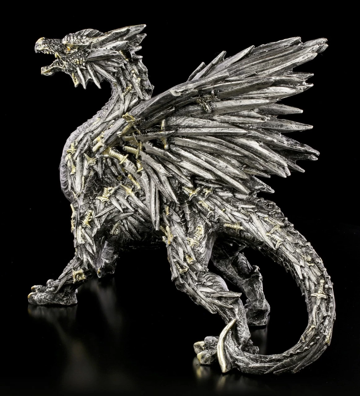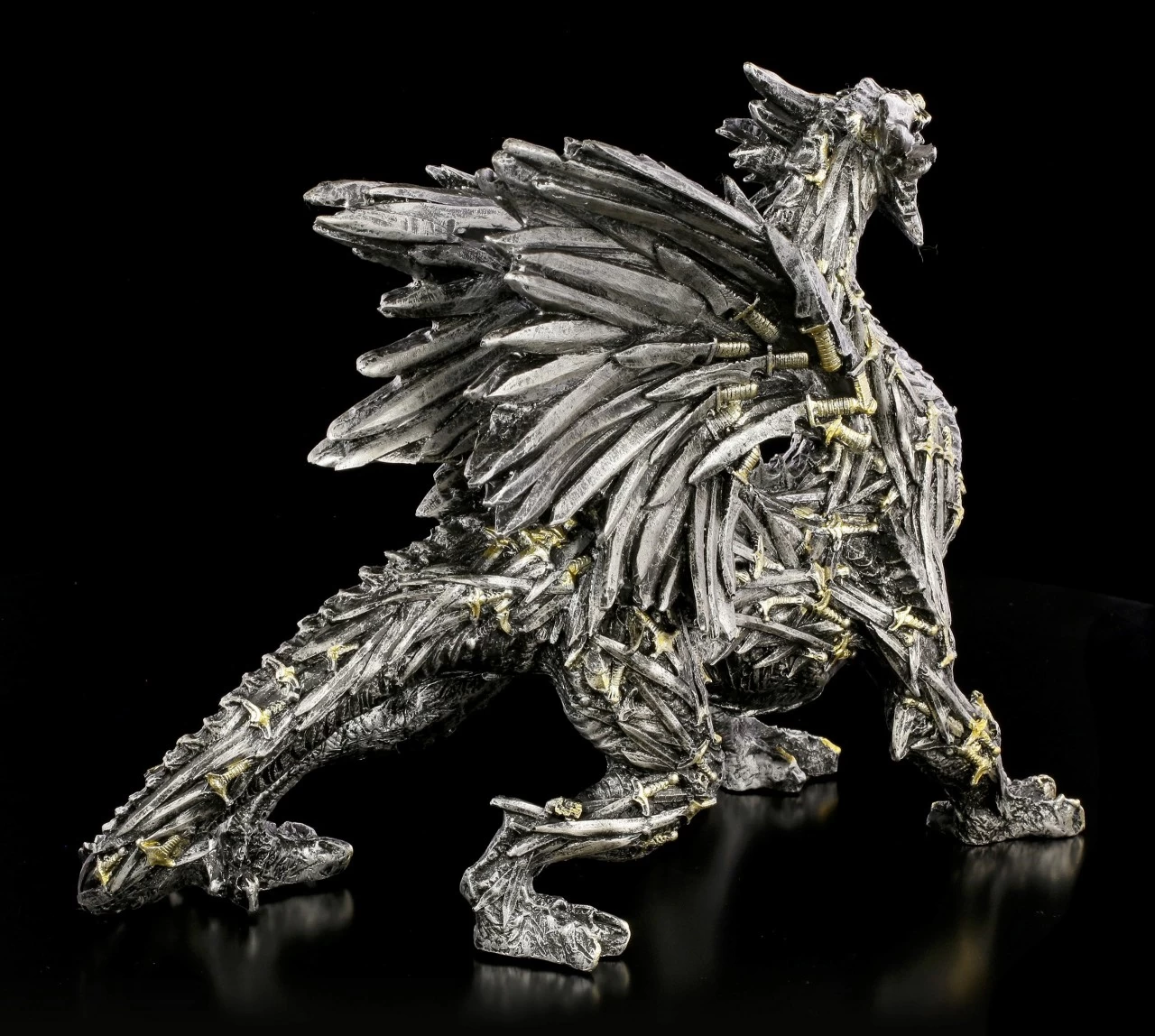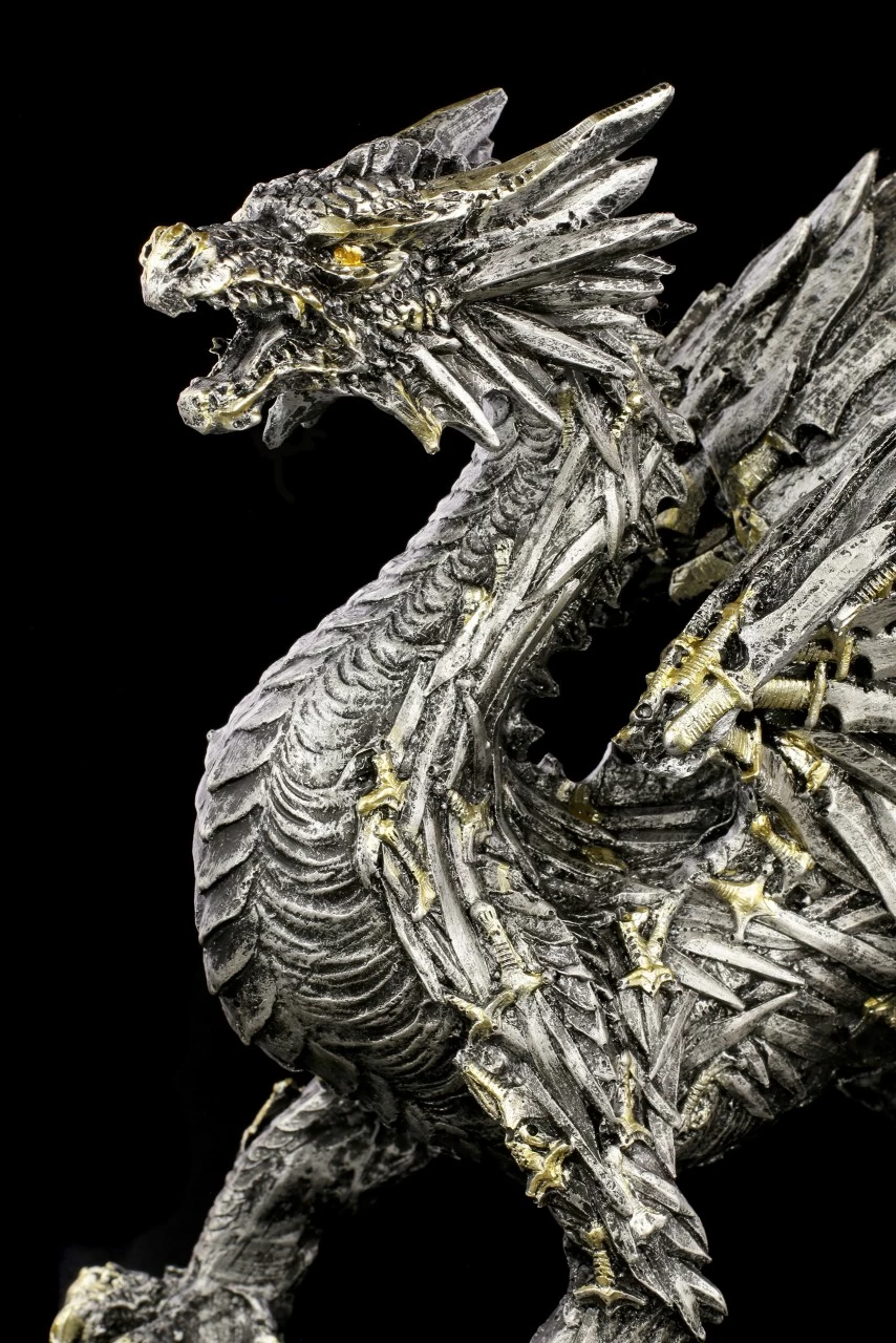 Wie direkt aus der Fantasie Welt entsprungen, steht dieser schwarze Schwertdrache vor dem Betrachter. Der Drache fällt sofort ins Auge, denn die Schuppen und die Drachenschwingen bestehen aus unzähligen schwarzen Schwertern, deren Hefte in leichten Kupfer glänzen. Der handbemalte Drache aus Kunststein (Polyresin) ist ein eindrucksvolles Dekorationselement.