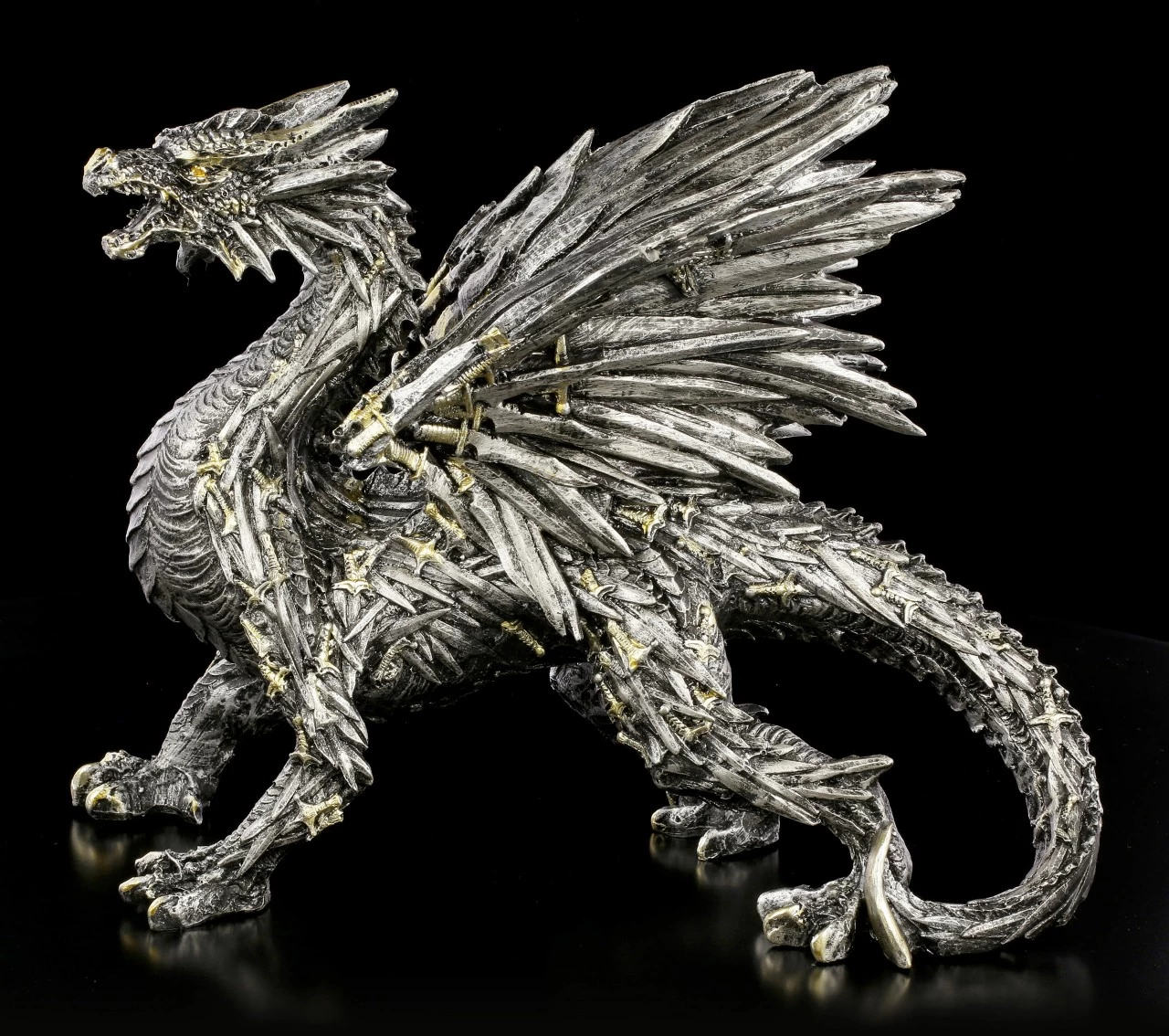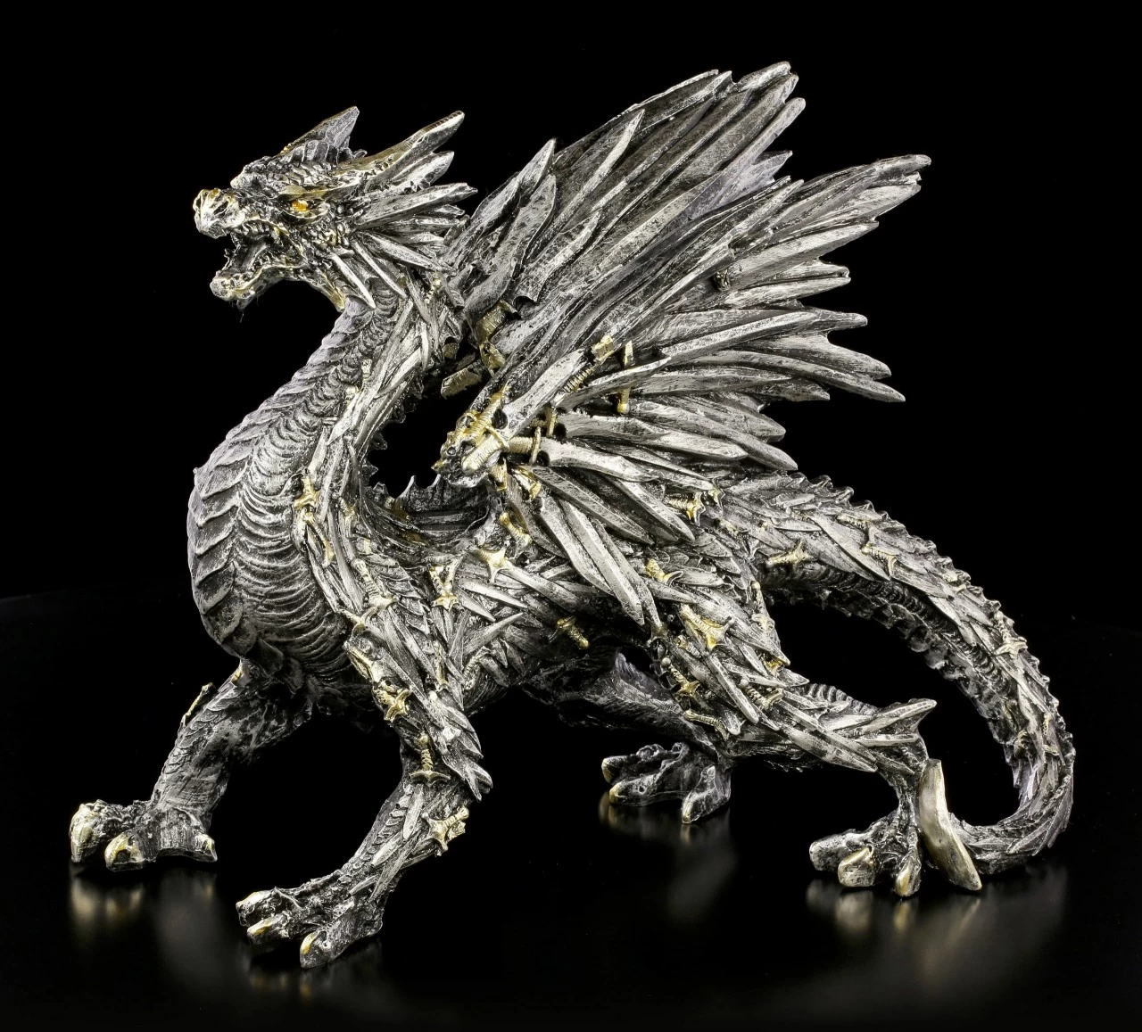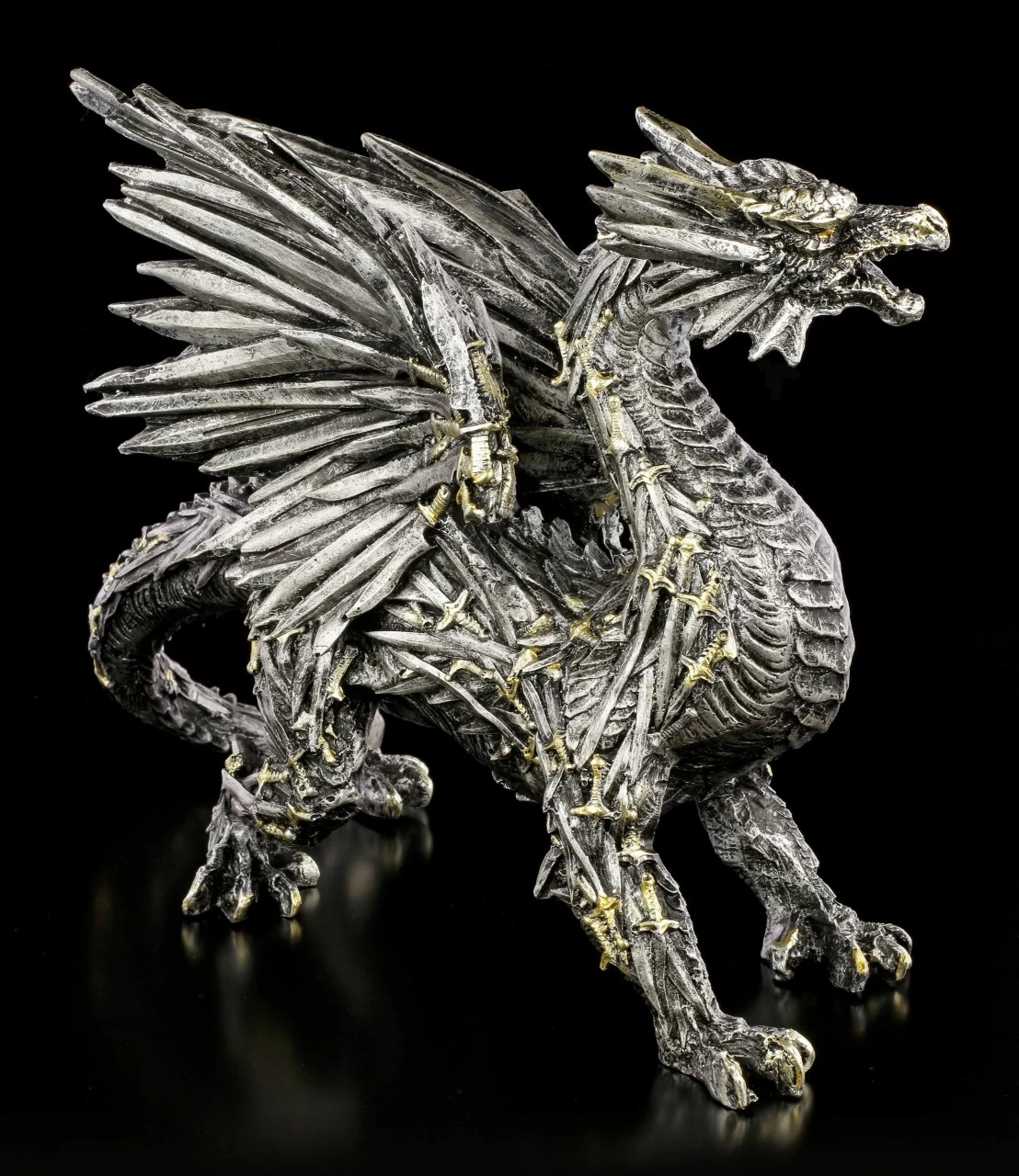 Wie direkt aus der Fantasie Welt entsprungen, steht dieser schwarze Schwertdrache vor dem Betrachter. Der Drache fällt sofort ins Auge, denn die Schuppen und die Drachenschwingen bestehen aus unzähligen schwarzen Schwertern, deren Hefte in leichten Kupfer glänzen. Der handbemalte Drache aus Kunststein (Polyresin) ist ein eindrucksvolles Dekorationselement.