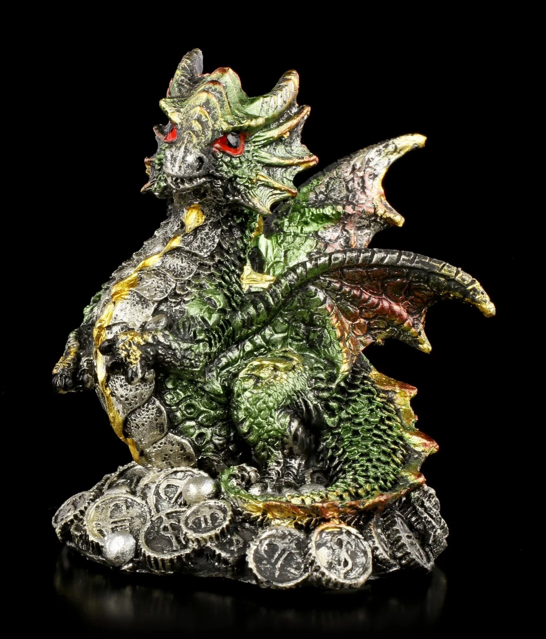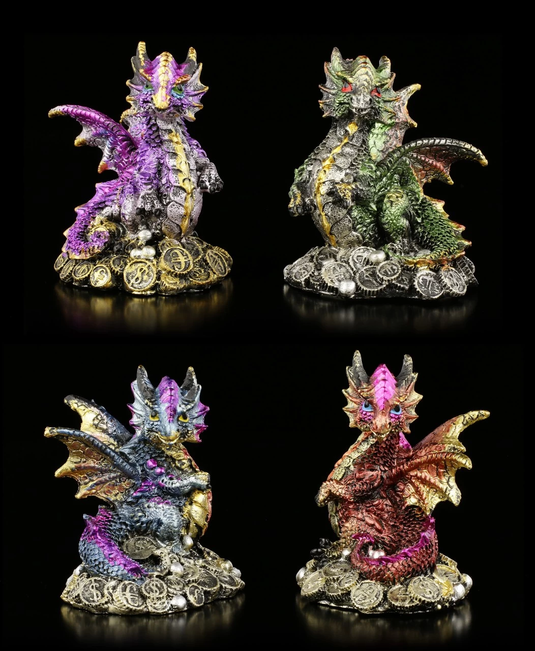 Verschenken Sie einen kleinen Glücksbringer, der dann für Geldsegen sorgen soll. Das süße bunte Drachen 4er Set aus Kunststein (Polyresin) ist liebevoll handbemalt. Jeder Drachenkenner weiß, dass Drachen einen Hort voller Edelsteine, Geld und andere Kostbarkeiten besitzen und diese vier süßen Drachen haben es sich jeweils auf einem Berg des Geldes bequem gemacht.