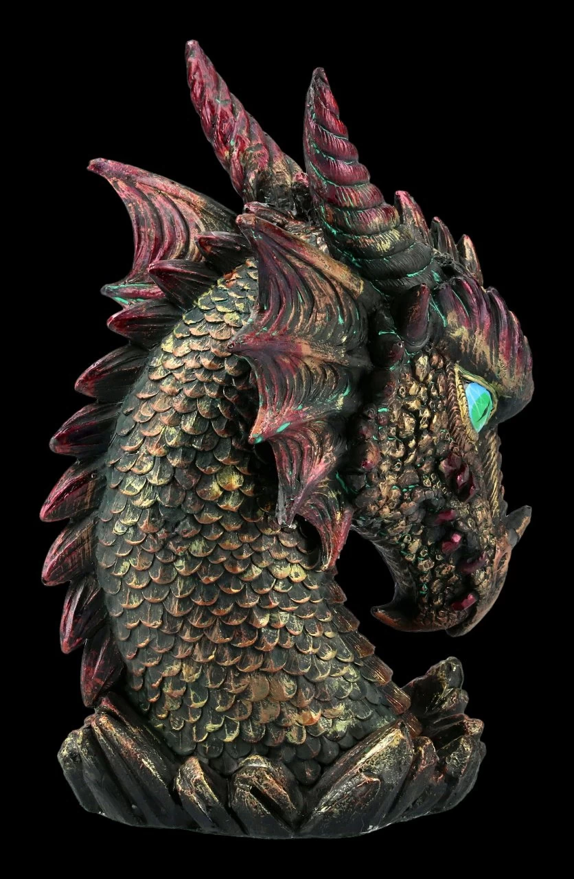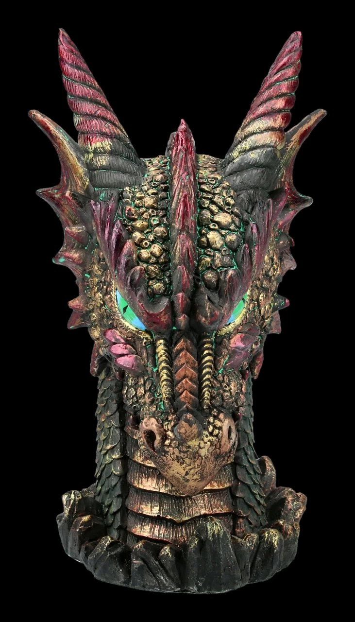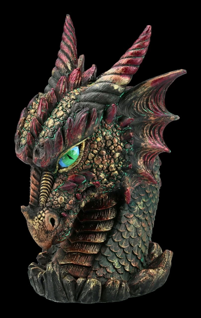 Mit dem anmutig geneigten Kopf ist diese Drachenkopf Büste ein ausgesprochen dekoratives Element für einen fantasievollen Einrichtungsstil. Die Drachenkopf Büste Sharok ist detailreich und sehr sorgsam aus handbemaltem Kunststein (Polyresin) gefertigt. Der schöne Drachenkopf ist mit seiner Höhe von 20,5 cm, der Breite von 11,5 cm und der Tiefe von 14,5 cm ein auffälliges und trotzdem stilvolles Dekoelement und auch ein wunderbares Geschenk für jeden Drachenfreund.