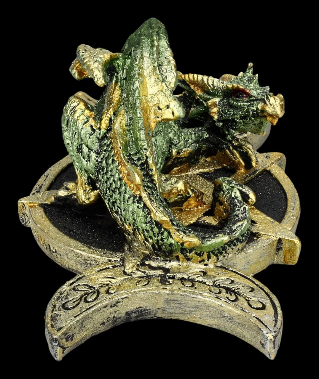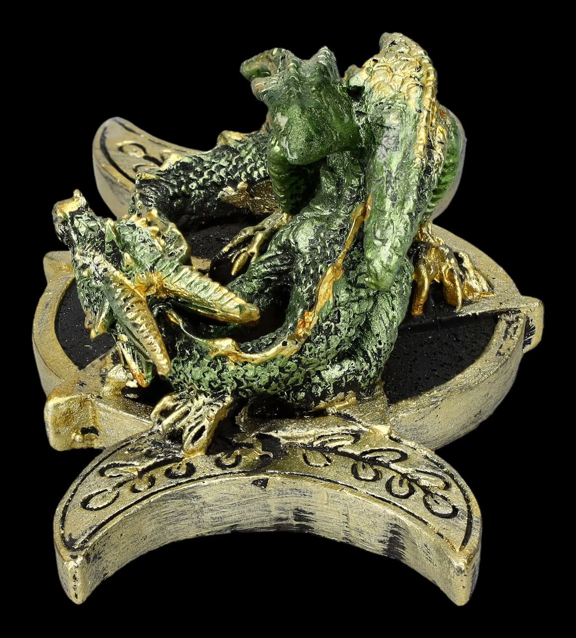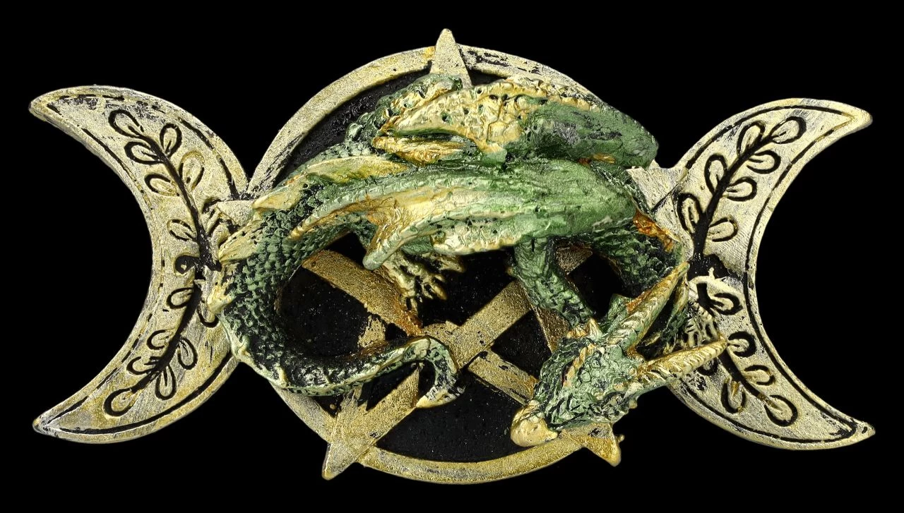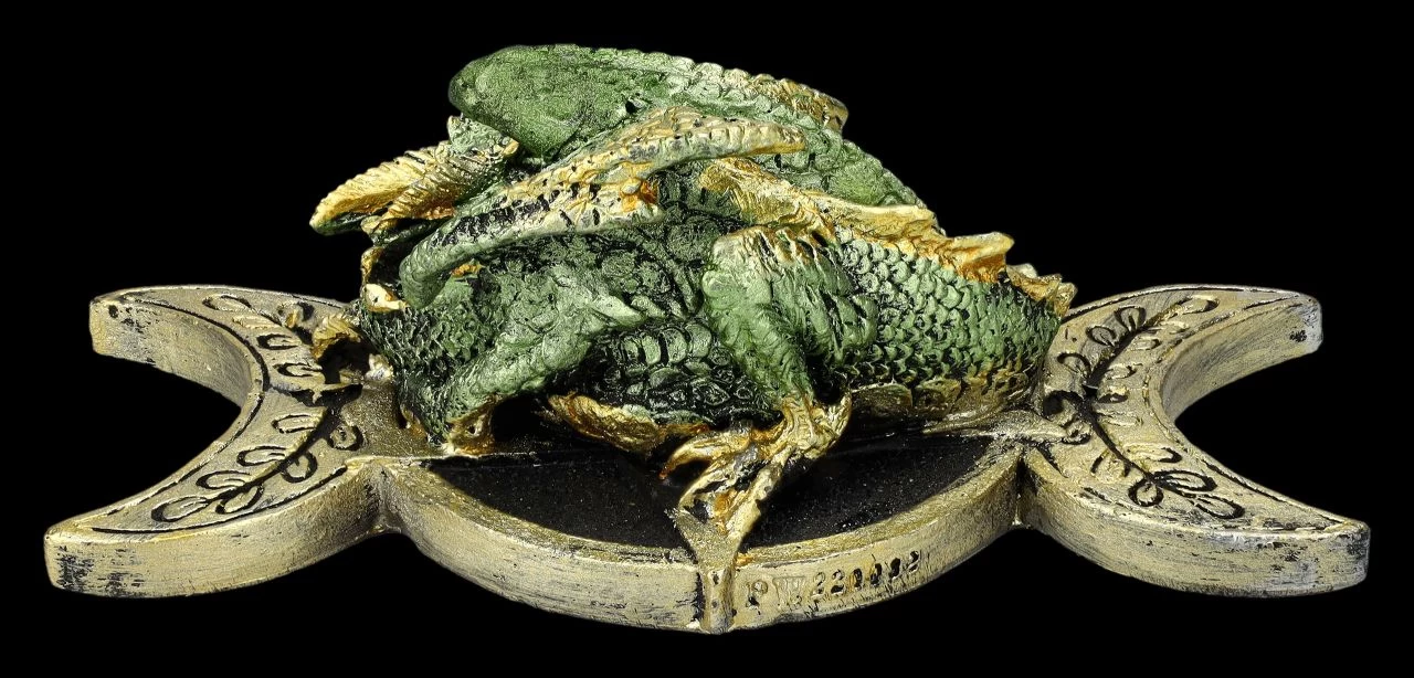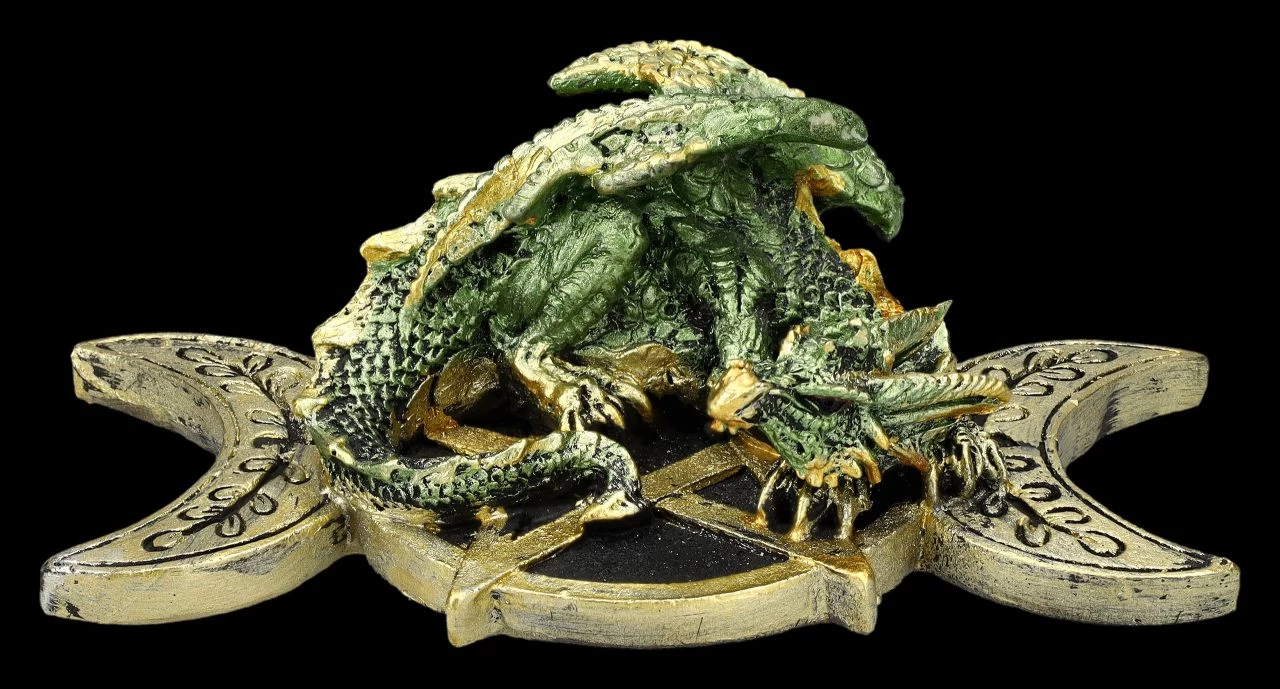 Selig ruht sich der grüne Drache auf dem kraftspendenen Symbol des Dreifach-Mondes aus. Ob er dabei seiner Wächterfunktion gerecht wird??? Die 5 cm hohe, 13 cm breite und 7 cm tiefe Drachenfigur wurde sorgfältig und detailreich aus Kunststein (Polyresin) gefertigt und von Hand bemalt. Nicht nur für die Wicca, sondern auch für alle großen und kleinen Drachen-Freunde ist diese Drachenfigur ein perfektes Geschenk.