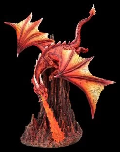 Selbst im geheimnisvollen verborgenen Land der Drachen wird der große rote Drache von allen anderen Drachen respektiert und vielleicht sogar gefürchtet. Denn wenn sein Zorn erregt wird, kann er ein Höllenfeuer entzünden und alles in Brand setzen, was sich in seiner Nähe befindet. Der beeindruckende rote Drache sitzt mit weit ausgebreiteten Flügeln angriffslustig hoch auf einem Felsen und zeigt seine höllische Kraft, indem er aus seinem wütend aufgerissenen Maul Feuer spuckt. Die fantastische rote Drachenfigur ist detailreich aus hochwertigem Kunststein (Polyresin) gefertigt und wurde sorgfältig von Hand bemalt. Der Höllenfeuer spuckende Drache ist 34 cm hoch, 23 cm breit und 26,5 cm tief. Die riesigen Flügel sind zum Stecken. Dieser furchterregende rote Drache ist nicht nur ein außergewöhnlicher Blickfang, für aller Drachensammler ist er auch ein perfektes Geschenk.