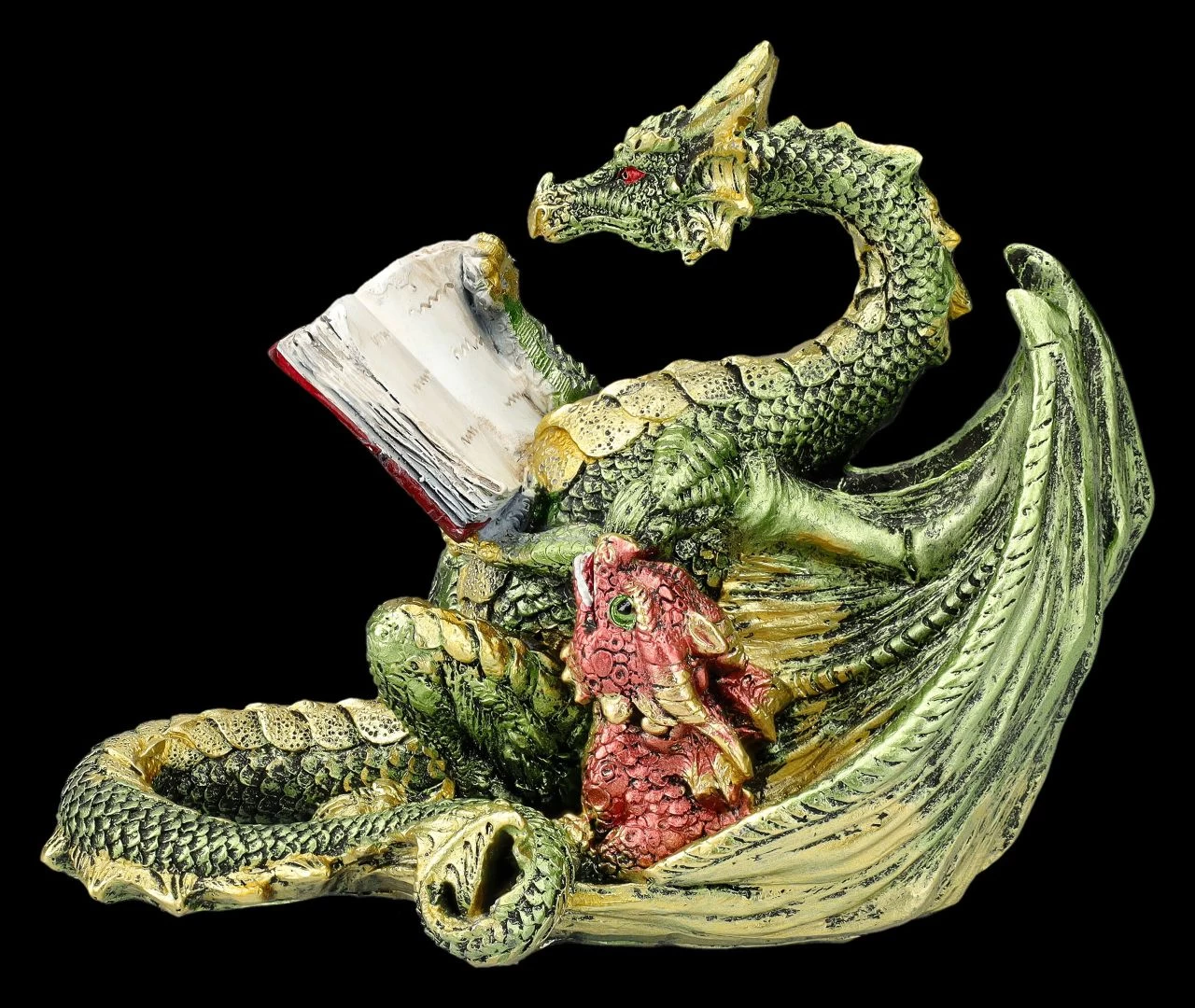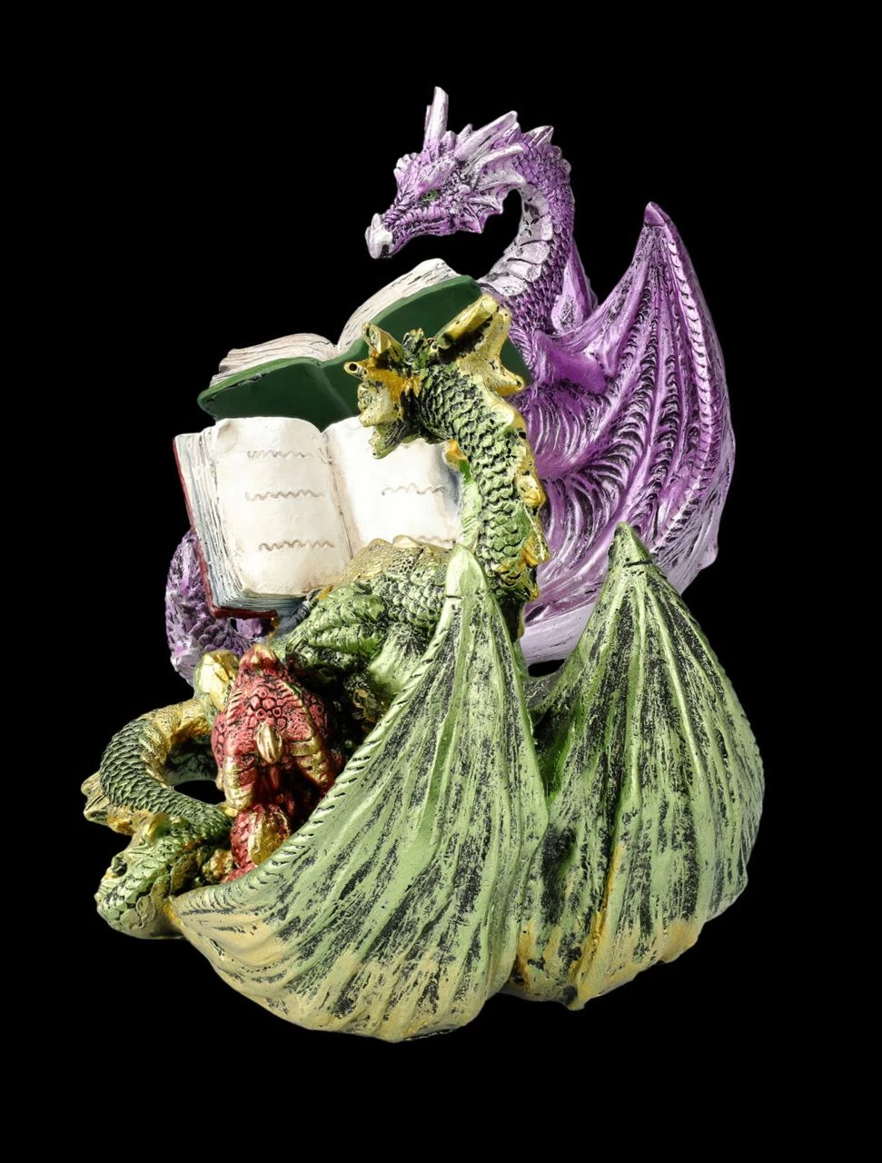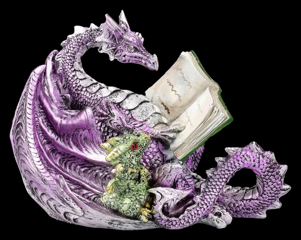 Eigentlich sollten die beiden großen Drachen dem Drachennachwuchs aus den alten Büchern die Geschichte der Drachen vorlesen. Sie finden aber das nun offenbar selbst so spannend, dass sie ganz vergessen, laut vorzulesen. ‚Wie geht die Geschichte weiter?‘ Das grüne Drachenbaby schaut den violetten Drachen etwas ratlos an und das rote Drachenbaby beklagt sich schon lautstark beim großen grünen Drachen. Die je 13,5 cm hohen, je 17 cm breiten und je 10,5 cm tiefen bunten Figuren mit den Geschichten lesenden Drachen sind sehr detailreich aus liebevoll handbemaltem Kunststein (Polyresin) gefertigt. Das 2er Set ist ein lustiges Geschenk für Sammler, das auch perfekt mit den Drachen-Freundinnen und Freunden geteilt werden kann. Es ist aber auch eine fantasievolle Deko für eine Bibliothek oder auch einen Bücherladen.
