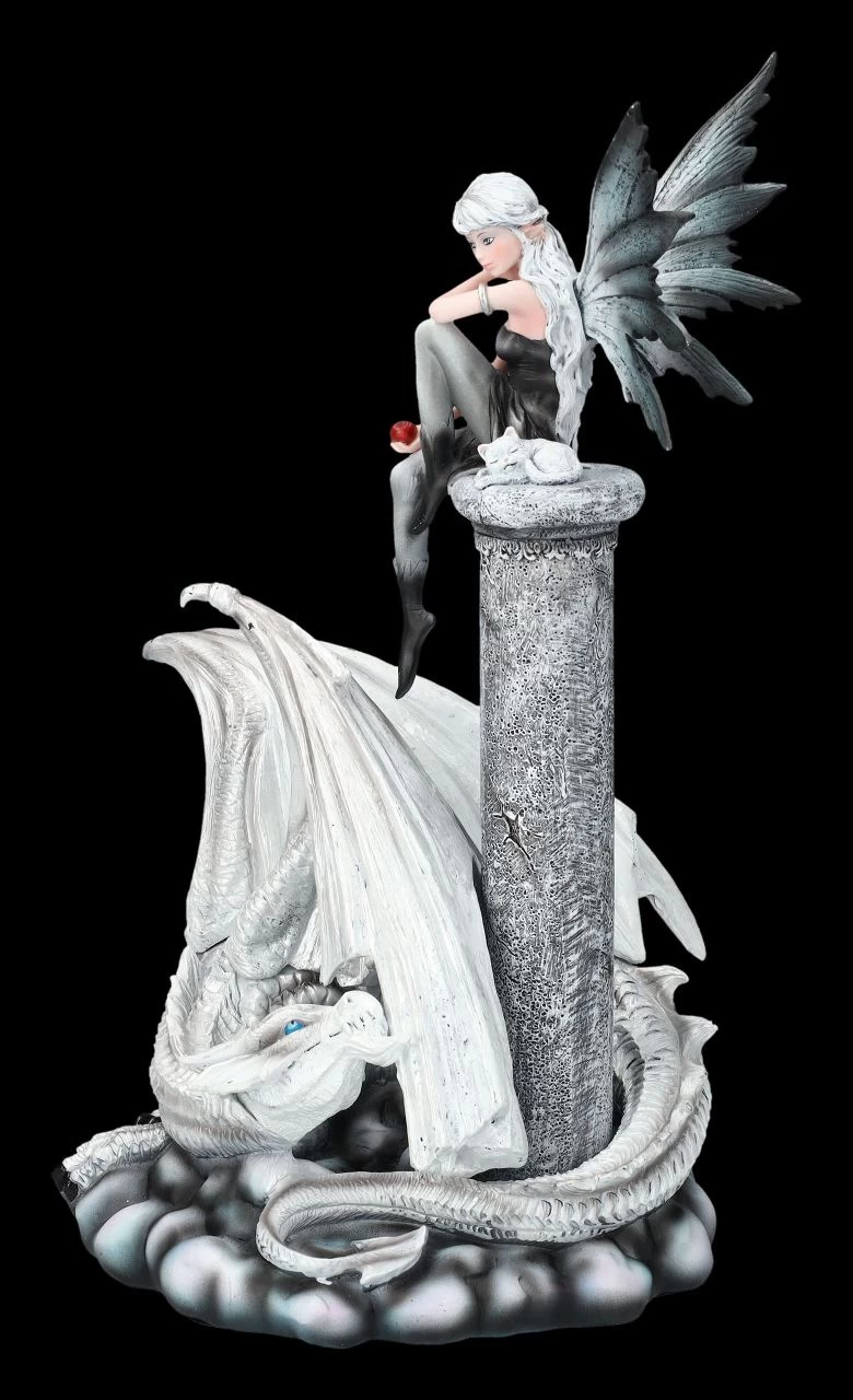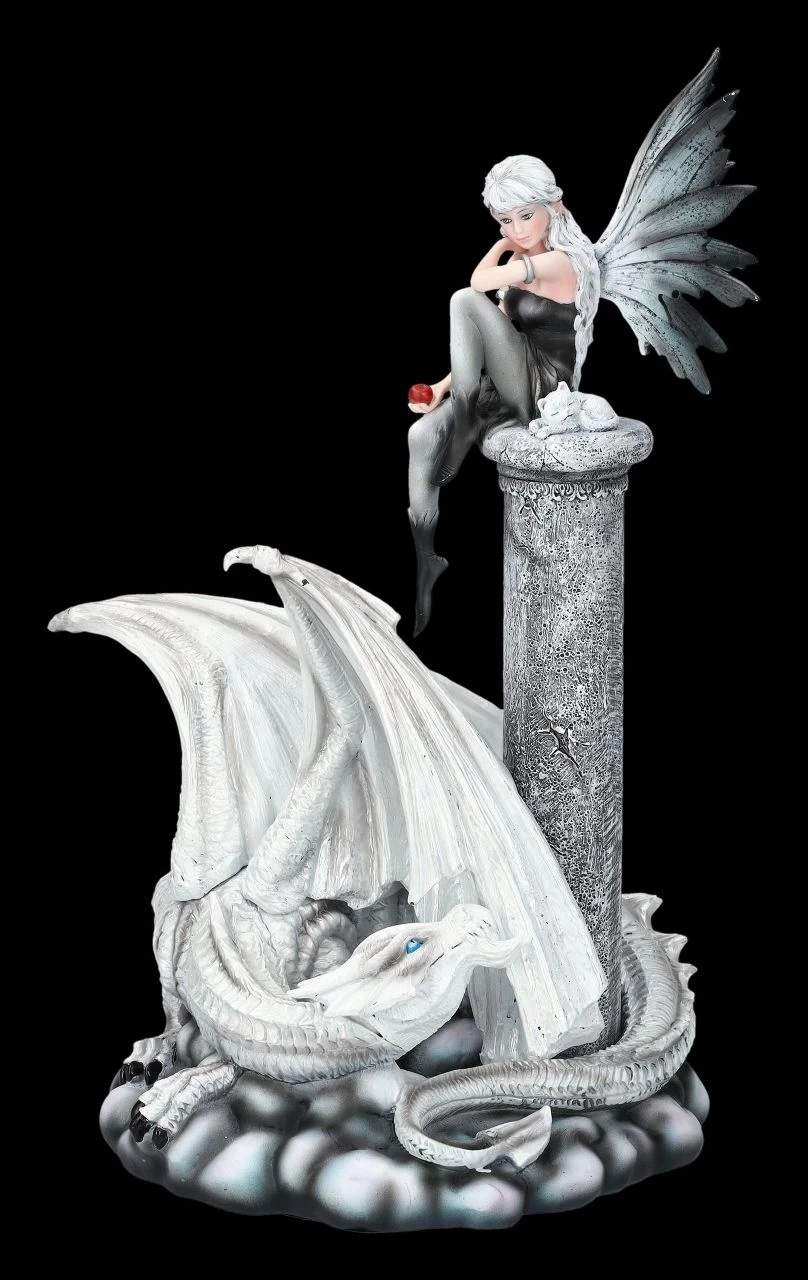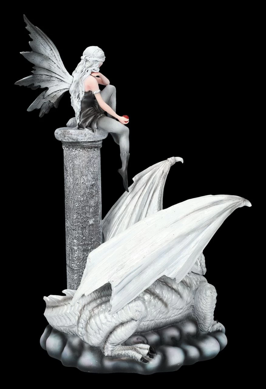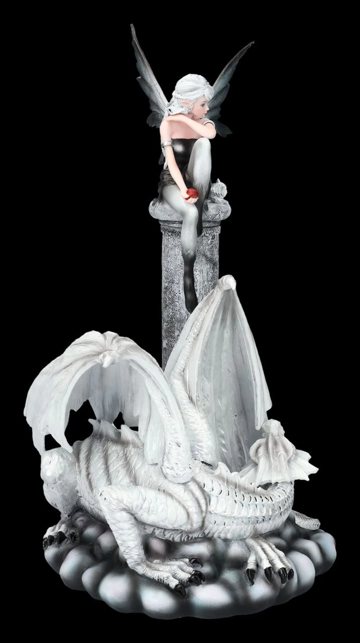 „Wen du auch immer mit dem roten Apfel in deiner Hand verführen möchtest – ich werde immer für dich da sein und dich beschützen“, sagt der große weiße Drache, der sich zu den Füßen der kleinen Elfe hingelegt hat. Mit seinen leuchtend blauen Augen schaut er die Elfe Alaina liebevoll an. Ihr kleines Kätzchen neben sich, sitzt Alaina hoch oben auf einem Felsen. Die beiden wissen, dass sie sich vor nichts fürchten müssen. Alaina mit dem weißen Drachen wurde aus liebevoll handbemaltem Kunststein (Polyresin) geschaffen. Die Flügel bei der 34 cm hohen, 24 cm breiten und 19,5 cm tiefen Elfen-Figur mit dem Drachen sind zum Stecken. Wer die Welt der Elfen und Drachen liebt, wird sich über die niedliche Elfe Alaina als Geschenk sicher sehr freuen.