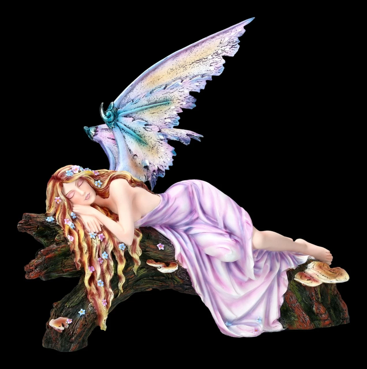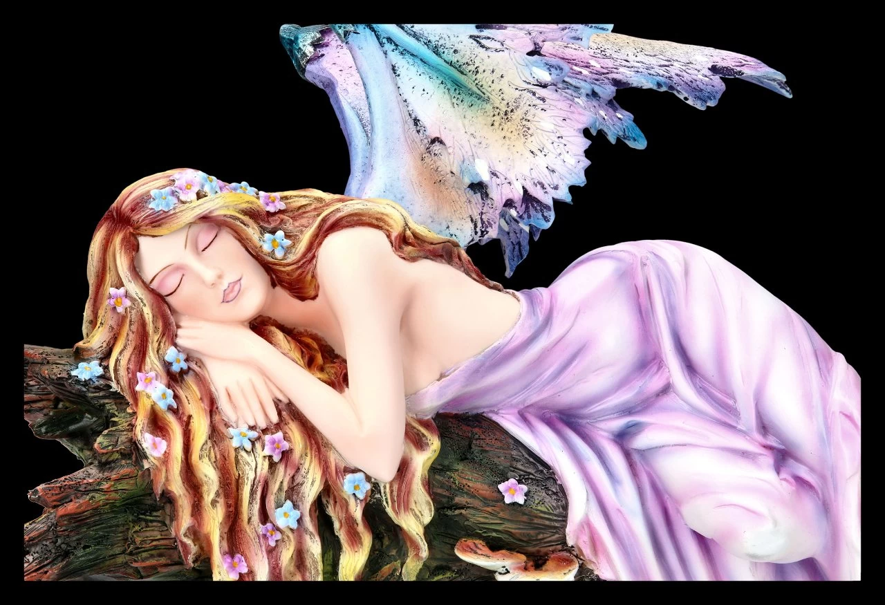 Psst – nicht wecken, möchte man am liebsten sagen, denn das glückliche Lächeln der Elfe Drema zeigt, dass sie sich in einer wunderschönen Traumwelt befindet. Die magisch schöne Elfe Drema hat sich in einem beinahe durchsichtigen lilafarbenen Negligé auf einen Baumstamm zum Schlafen hingelegt. In ihrem langen Haar haben sich zahlreiche Blüten gefangen. Ihre schönen, Schmetterlingsartigen Flügel scheinen ihr einen leichten Windhauch zuzufächern. Die zarte, träumende Elfenfigur ist detailreich aus Kunststein (Polyresin) gefertigt und liebevoll handbemalt. Sie ist 31 cm hoch, 33 cm breit und 20 cm tief. Ihre Flügel sind zum Stecken.