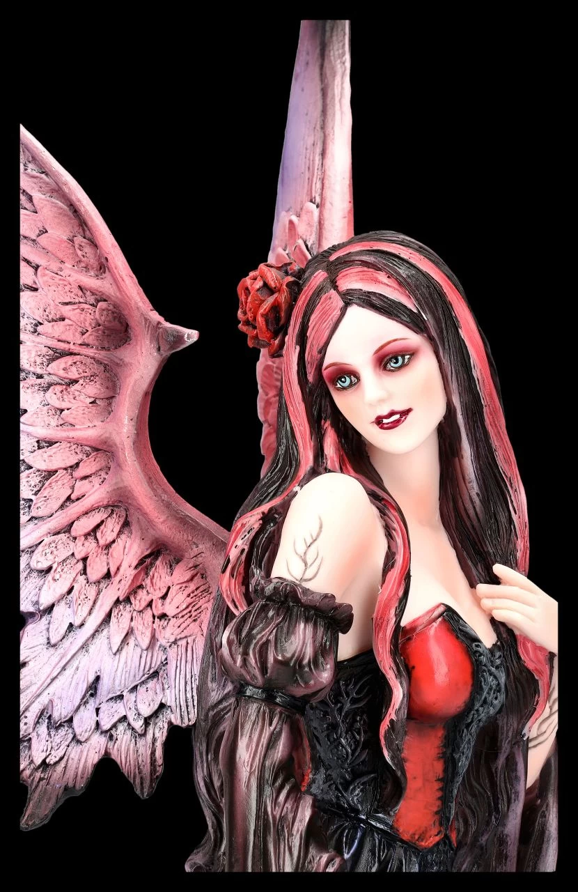 ‚Wer hat Mut genug, sich mir zu nähern?‘ Verführerisch zeigt die wunderschöne Dunkle Elfe ihre langen Beine mit dem faszinierenden Tattoo Mystique trägt lange schwarze Stiefel zu ihrem langen schwarz-rotes Kleid mit dem leuchtend roten Mieder. Die teuflisch schöne Elfe Mystique mit den langen roten Haaren steht mit neckisch zur Seite geneigtem Kopf herausfordernd auf einem Schädelberg. Die faszinierende Elfen-Figur ist detailreich aus Kunststein (Polyresin) gefertigt und liebevoll von Hand bemalt. Die großen, rötlich-schwarzen Flügel sind zum Stecken. Die faszinierende Elfen-Figur Mystique ist 39,5 cm hoch, 19,5 cm breit und 21 cm tief und wird garantiert überall zum absoluten Blickfang. Die magische Mystique auf dem Schädelberg ist für alle Elfenfreunde und Sammler ein wunderbares Geschenk