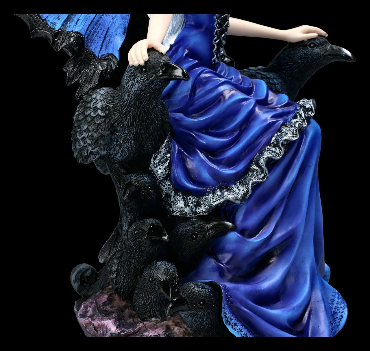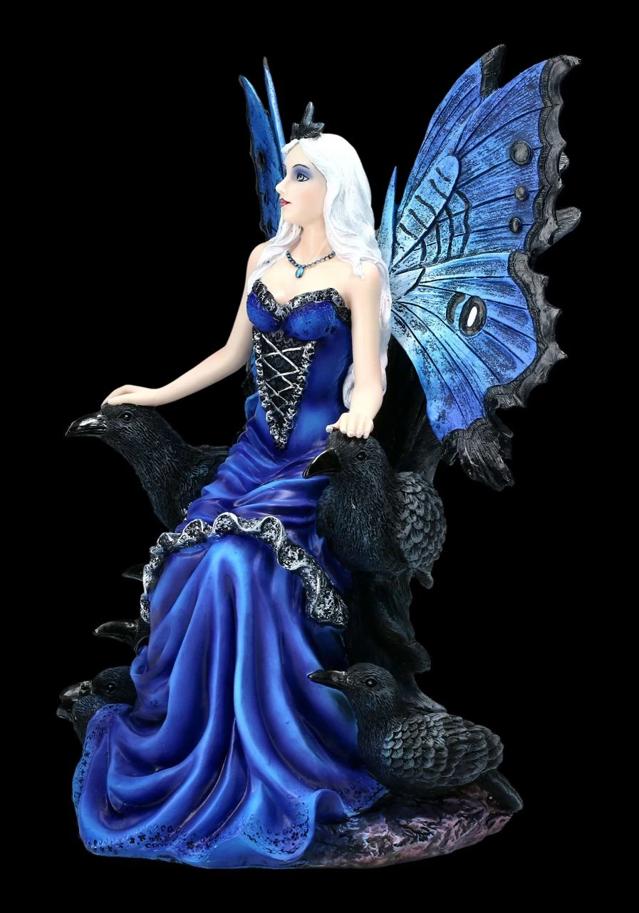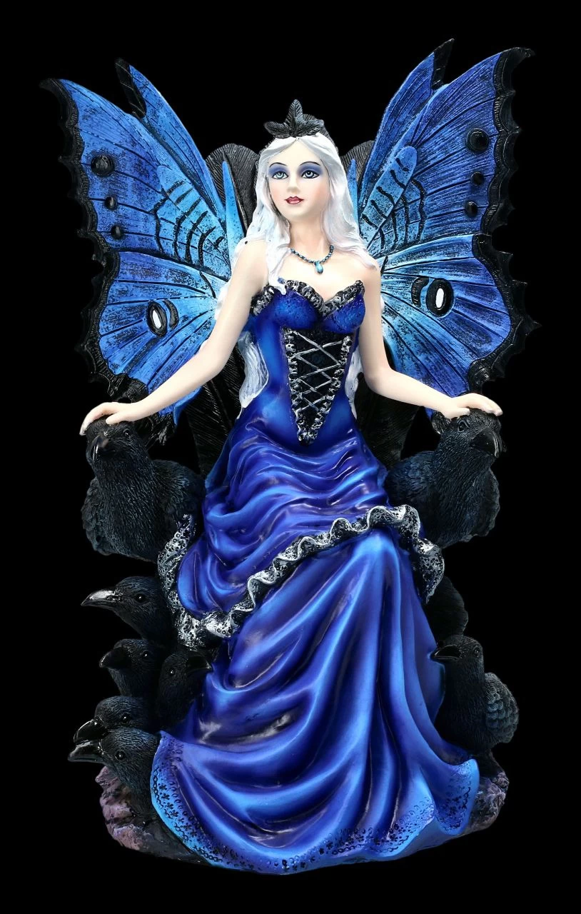Stolz, in ein nachtblaues Kleid gehüllt, sitzt die Rabenkönigin auf ihrem Thron. An den beiden Seiten der beeindruckenden Rabenkönigin sitzen ihre Gefährten, auf die sie sanft ihre Hände legt. Zu ihren Füßen sitzen die jungen Raben. Hinter den zart gemusterten blauen Flügeln der schönen Elfe ist das Rabengefieder zu sehen. Die Rabenkönigin ist ausserordentlich detailreich aus sorgfältig handbemaltem Kunststein (Polyresin) gefertigt. Sie ist 29,0 cm hoch, 17,0 cm breit und 20,0 cm tief. Die kunstvoll gemalten Flügel der Elfe sind zum Stecken.