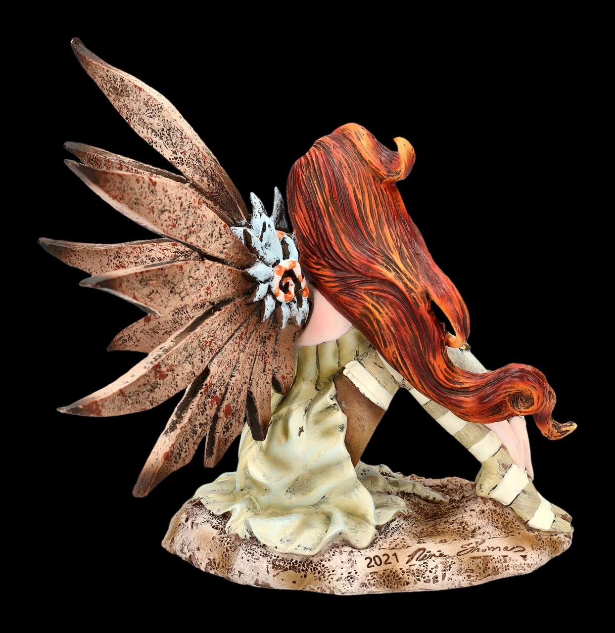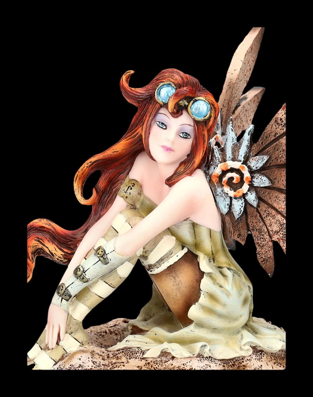 Mode- und Stilrichtungen gehen auch in der Welt der Elfen und Feen nicht so einfach vorbei und rebellische kleine Elfen, die sich – noch – nicht mit feinen Kleidern schmücken, gibt es natürlich auch. Die kleine Elfe mit den langen roten Haaren und den lustig geringelten Strümpfen liebt, wie man sieht, den Steampunk und hat sich sogar die passenden Flügel angesteckt. Sie sitzt auf einem Stein und blickt jeden herausfordernd an. Und so nennt die amerikanische Fantasykünstlerin Amy Brown, die für ihre fantasievollen Arbeiten berühmt ist, die kleine freche Elfe auch ‚Steampunk Fae‘. Amy Brown, die sich schon als Kind für die sagenhafte Welt der Elfen, Feen und Drachen interessiert hatte, machte sie später zum Mittelpunkt ihrer kreativen Arbeit. Die niedliche Elfen-Figur wurde aus hochwertigem Kunststein (Polyresin) gegossen und liebevoll von Hand bemalt. Sie ist 14 cm hoch, 14,5 cm breit und 14 cm tief und die Flügel sind zum Stecken. Die Steampunk Fae ist ein perfektes Geschenk für Sammler der Arbeiten von Amy Brown und für alle, die sich gerne in die Welt der Elfen, Feen und Drachen hineinträumen.