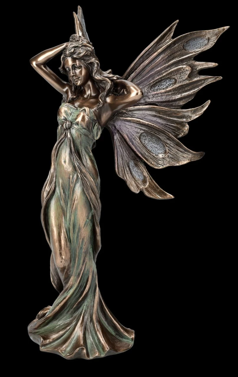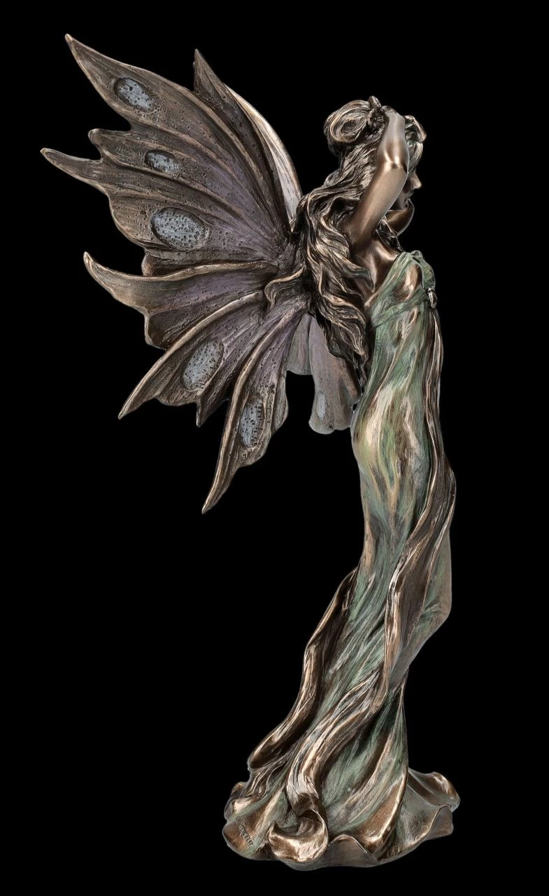 Durch die edle Bronzierung und fein abgestimmte Colorierung in ganz zarten Blautönen, wirkt das Kleid der bezaubernden Elfe wie ein beinahe durchsichtiges Negligé. Es sieht aus, als wäre sie gerade aus schönen Träumen erwacht und würde sich nun wohlig räkelnd mit ihren Händen durch das lange lockige Haar streichen. Mit ihren feinen Gesichtszügen, den schönen großen Flügeln und dem fließenden Kleid wirkt diese zauberhafte Elfenskulptur beinahe wie eine Arbeit aus der Jugendstilzeit. Die 25 cm hohe, 15 cm breite und 12 cm tiefe entzückende Elfen Figur aus der Studio Collection von Veronese ist aus hochwertigem Kunststein (Polyresin) und wird in jedem Ambiente zum sofortigen Blickfang. Sie ist für jeden Sammler und für alle, die die fantasievolle Welt der Elfen lieben, ein wunderschönes Geschenk.