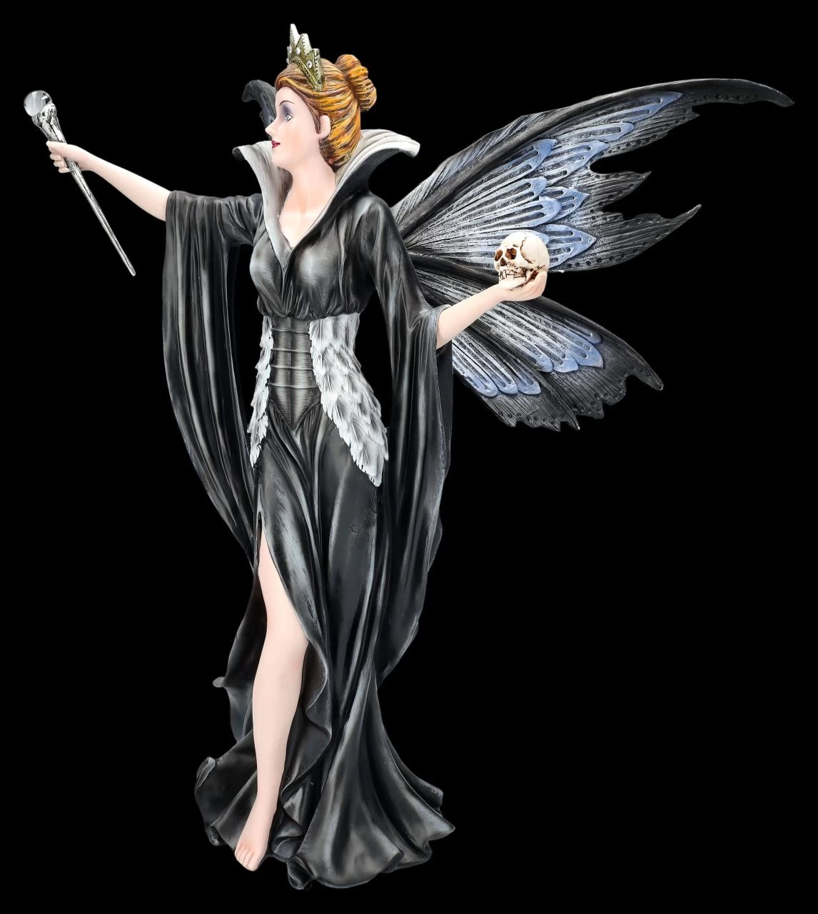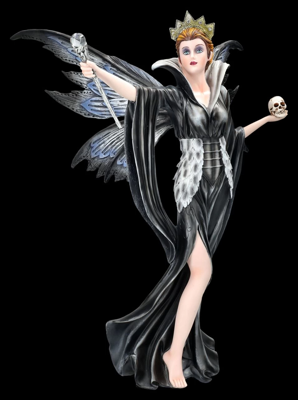 Alle Magier und Hexen werden von der Königin der Elfenwelt zur großen Konferenz geladen. Der Ruf ihrer Weisheit, aber auch ihrer Schönheit hat sich längst bis in die weit verstreuten Länder der Elfenwelt verbreitet. Und so ist es kein Wunder, dass alle eingeladenen Zauberwesen ihrem Ruf folgen. Mit ihrem Zauberstab als Zepter in der rechten Hand und einem Totenschädel in der linken betritt die Königin der Elfenwelt die Bühne. In ihrem langen, seidig fließenden schwarzen Kleid und mit der Tiara in ihrem hochgesteckten rötlichen Haar beeindruckt sie jeden, der sie sieht. Die wunderschöne und beeindruckende dunkle Figur der Königin mit Zepter und Schädel ist detailreich aus Kunststein (Polyresin) gefertigt und sorgfältig von Hand bemalt. Die herrliche Elfenfigur ist 46 cm hoch, 40 cm breit und 30 cm tief und ihre großen Flügel sind zum Stecken. Diese mystische und wunderschöne Elfenkönigin verdient einen Platz, an dem sie sofort entdeckt und bewundert werden kann. Für Sammler und alle, die von der magischen Welt der Elfen begeistert sind, ist diese schöne mystische Königin ein perfektes Geschenk.