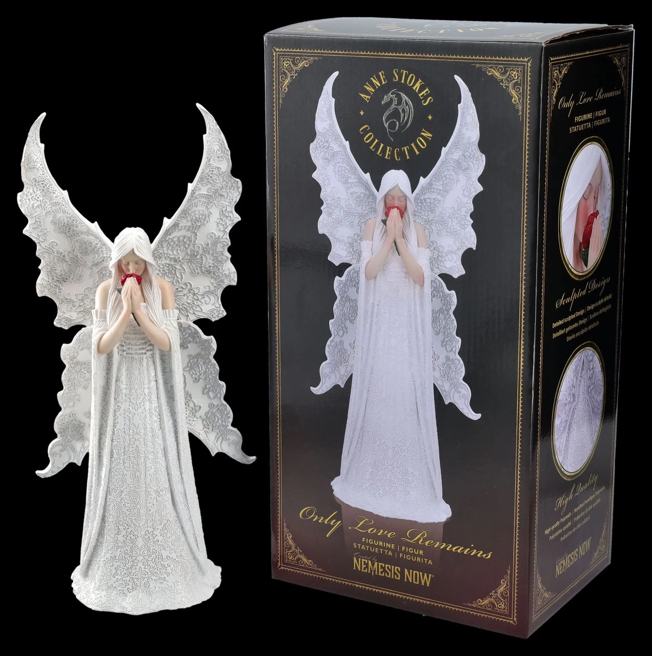 ‚Only Love Remains‘ nennt die berühmte Künstlerin Anne Stokes ihren wunderschönen weißen Engel, der sich trauernd über die rote Rose in seinen Händen beugt. Doch Engel behüten auch schöne Erinnerungen und zeigen, dass sie mit ihrer Liebe immer für einen da sind. Der beeindruckend schöne Engel mit den großen Flügeln ist mit viel Liebe zum Detail kunstvoll gearbeitet und sehr zart von Hand bemalt. Er ist 35 cm hoch, 16,5 cm breit und 11,5 cm tief und als Zeichen der Liebe oder auch zum Trost ein wunderbares Geschenk und kommt inklusive eines schön bedruckten Geschenkkartons.