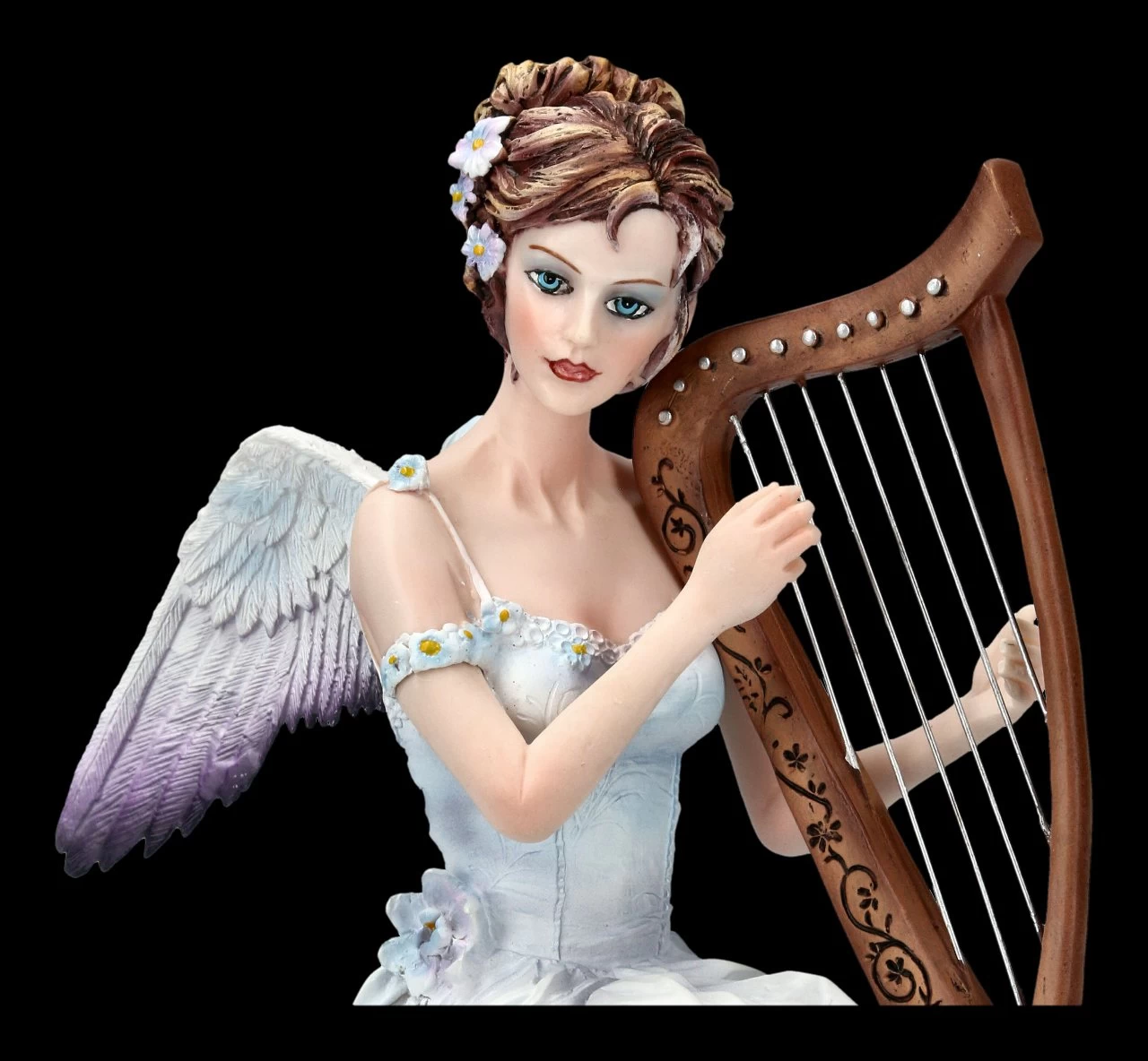 Beinahe hört man die zarten Töne, so versunken ist der wunderschöne Engel Chorus beim Spiel auf der Harfe. Alle hören ihm zu und eine Taube hat sich direkt auf den Schoß des Engels gesetzt. Der elegante, leibevoll handbemale Engel in dem aufwändigen weißen Kleid stammt aus der Künstlerwerkstatt von Nene Thomas. Die Figur ist aus hochwertigem Kunststein (Polyresin) gefertigt und wird in einer Geschenkverpackung geliefert. Sie ist ein wunderbares Geschenk an einen Sammler.und alle, die von den zarten Klängen einer Harfe begeistert sind.
