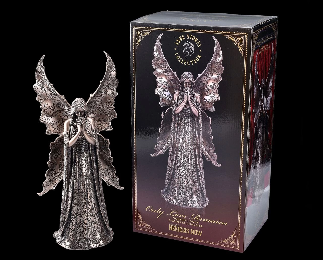Only Love Remains – dieser hinreißend gestaltete, edel bronzierte Engel aus dem Atelier der Künstlerin Anne Stokes bringt eine himmlische Stimmung in Ihr Heim. In Gedanken versunken schnuppert er an einer Rose, die er in seinen Händen hält. Der 36 cm hohe, 15 cm breite und 12 cm tiefe wunderschöne Engel wurde sorgsam aus Kunststein (Polyresin) gefertigt. Das schlichte, lange Kleid und die Flügel sind mit Mustern verziert. Der anmutige Engel ist nicht nur eine wunderbar romantische Dekoration, er ist auch ein fantastisches Geschenk für Ihren persönlichen Engel und kommt inklusive eines schön bedruckten Geschenkkartons.
