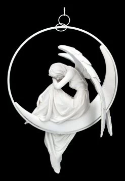 Weiße Engelfigur auf Mondsichel sitzend