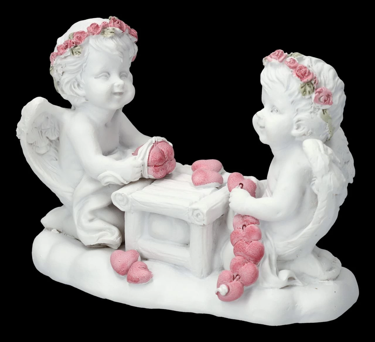 Liebe zu verschenken ist ihre Aufgabe, daher sitzen die beiden niedlich Putten fröhlich an ihrem Tisch und basteln zahlreiche Herzen. Je fleißiger sie sind, umso besser, denn sie gehören zu der Engelschar die in unserem Shop gelandet ist. Die Figur mit den bastelnden Putten ist 8 cm hoch, 11 cm breit und 5,5 cm tief. Sie wurde aus liebevoll handbemaltem Kunststein (Polyresin) gefertigt und ist nicht nur für jeden Hochzeitstisch eine tolle Deko, sie ist auch ein fantastisches Geschenk für den Engel seines Herzens.