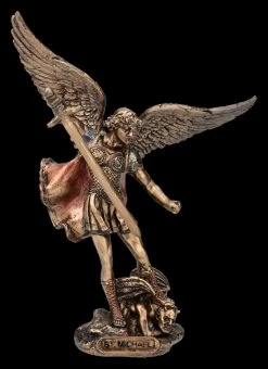 Die großen Flügel weit ausgebreitet, den linken Fuß auf den Körper des Teufels gestellt, die als gefallener Engel zu seinen Füßen liegt und den rechten Arm mit dem Schwert hoch erhoben und bereit zuzustoßen, so steht die Figur des Erzengel Michael auf dem mit seinem Namen beschrifteten Sockel. Bis zu den einzelnen Details ist dieses Symbol des Sieges über das Böse von Veronese fantastisch dargestellt. Die kleine, fein bronzierte und zurückhaltend colorierte Statue des Erzengel Michael beim Sieg über den Teufel ist aus Kunststein (Polyresin) und stammt aus der Studio Collection von Veronese. Sie ist 10 cm hoch, 7 cm breit und 3,5 cm tief und passt auch wunderbar in eine Krippe. Sie ist aber auch ein perfektes Geschenk für alle, die den Namen Michael tragen.