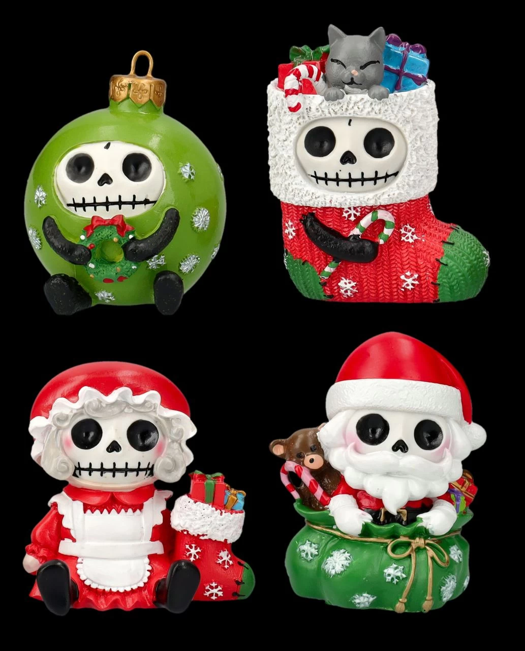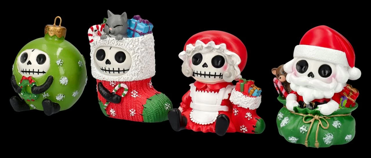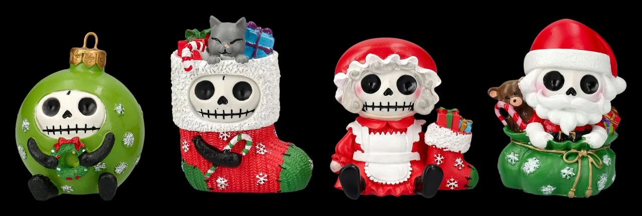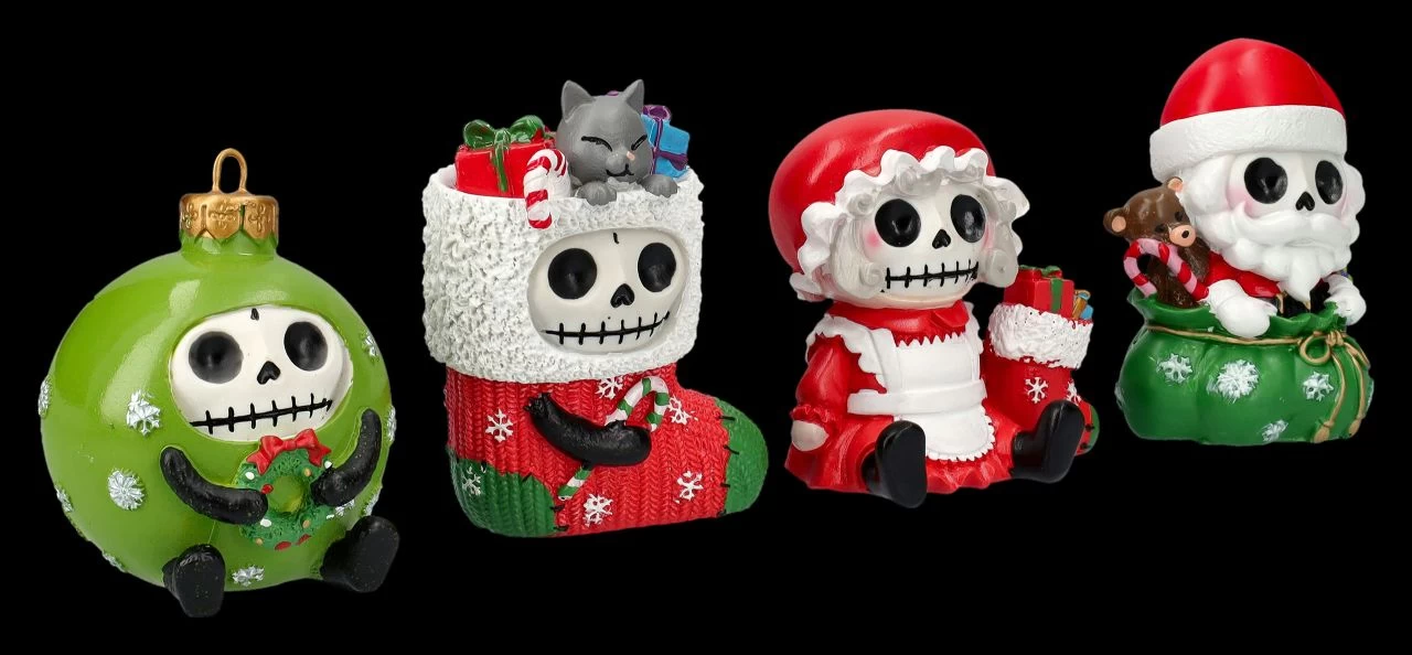 Da haben sich die kultigen Furrybones wieder selbst übertroffen und sich genial verkleidet. Bulby hat sich in einer grünen Weihnachtskugel versteckt und ist darin kaum zu entdecken. Stockton hat sich für den roten Weihnachtsstrumpf entschieden und hofft wohl, dass etwas für ihn dabei abfällt. Mrs Claus kommt vermutlich direkt aus der Backstube und hat die Weihnachtssocke gleich mit ‚Köstlichkeiten‘ aus ihrer Weihnachtsküche gefüllt. Und Santa, der Weihnachtsmann hat sich selbst in den Sack mit dem Spielzeug gesteckt… Die vier niedlichen Furrybones sind detailliert aus Kunststein (Polyresin) gefertigt und mit viel Liebe von Hand bemalt. Sie sind 7 – 8,5 cm hoch, 6 -7 cm breit und 4 – 6 cm tief. Für alle Fans der niedlichen und zugleich etwas gruseligen Furrybones-Skelettchen ist diese exklusive Sammleredition mit dem aktuellen Furrybones Weihnachts-Set 2023 einfach ein geniales Geschenk. Die kultigen vier Helden sind aber auch eine absolut süßes Mitbringsel zur Weihnachts-Party-Einladung und kommen passenderweise gleich in einem Geschenkkarton.