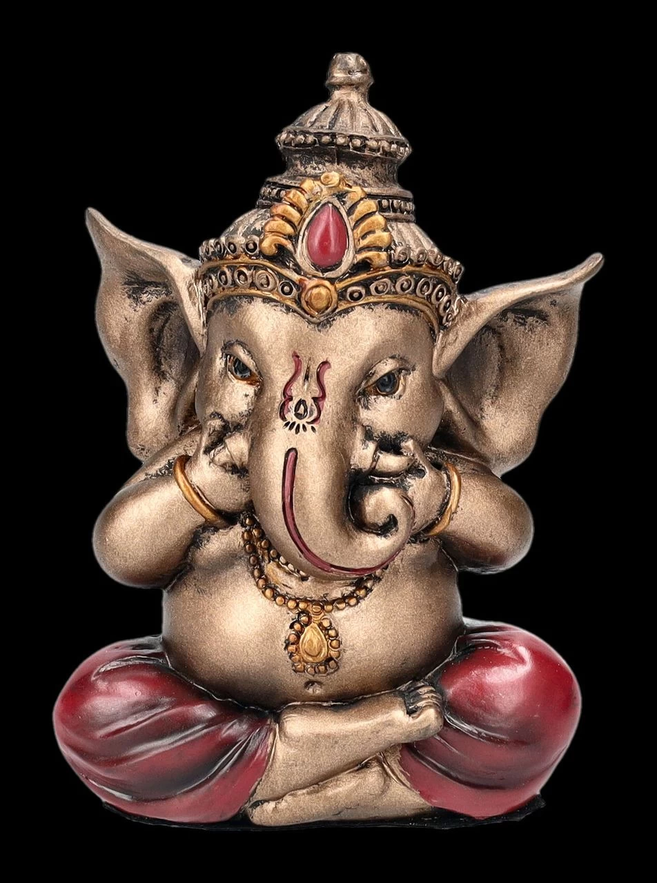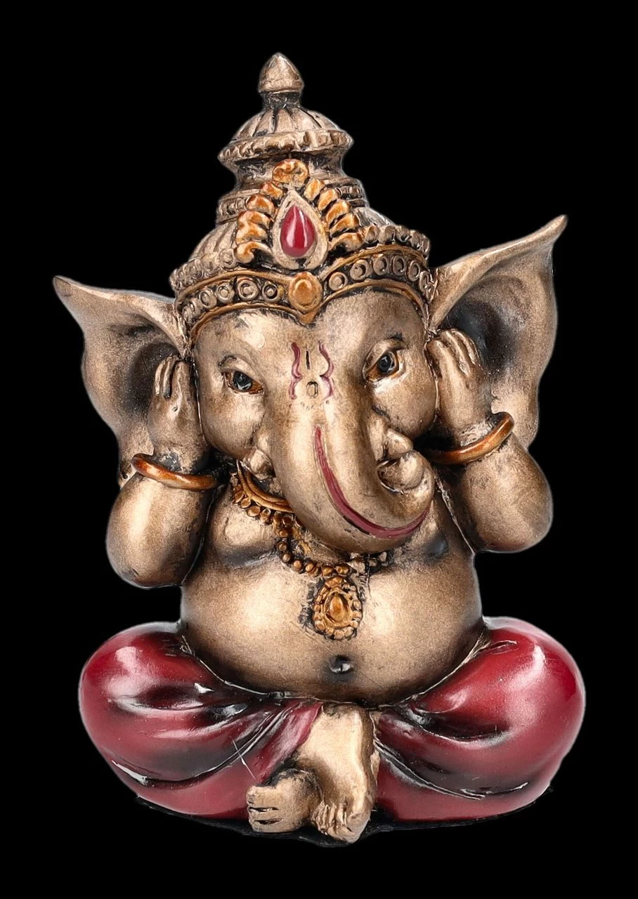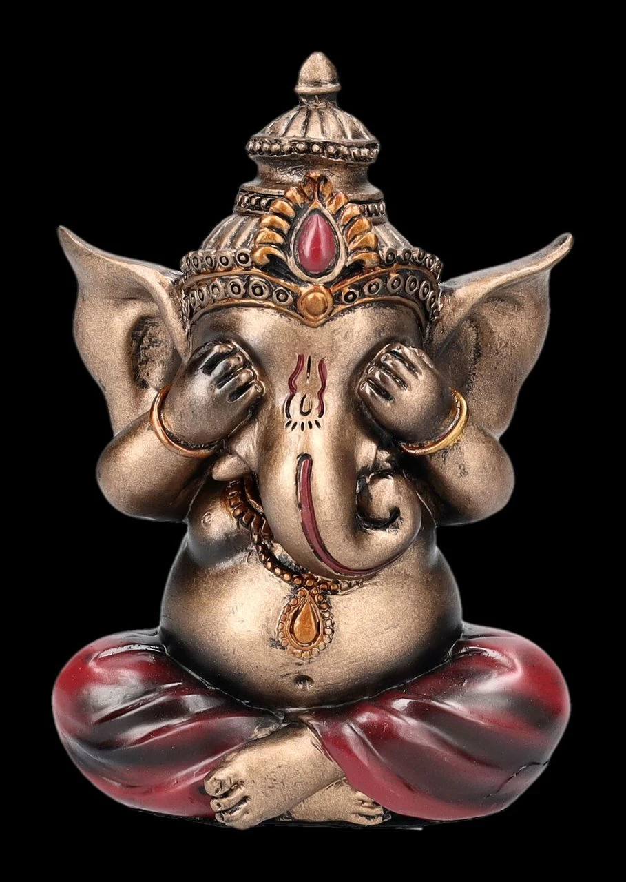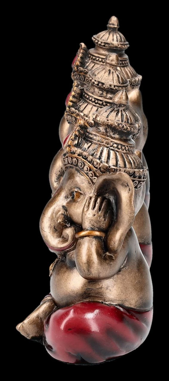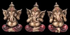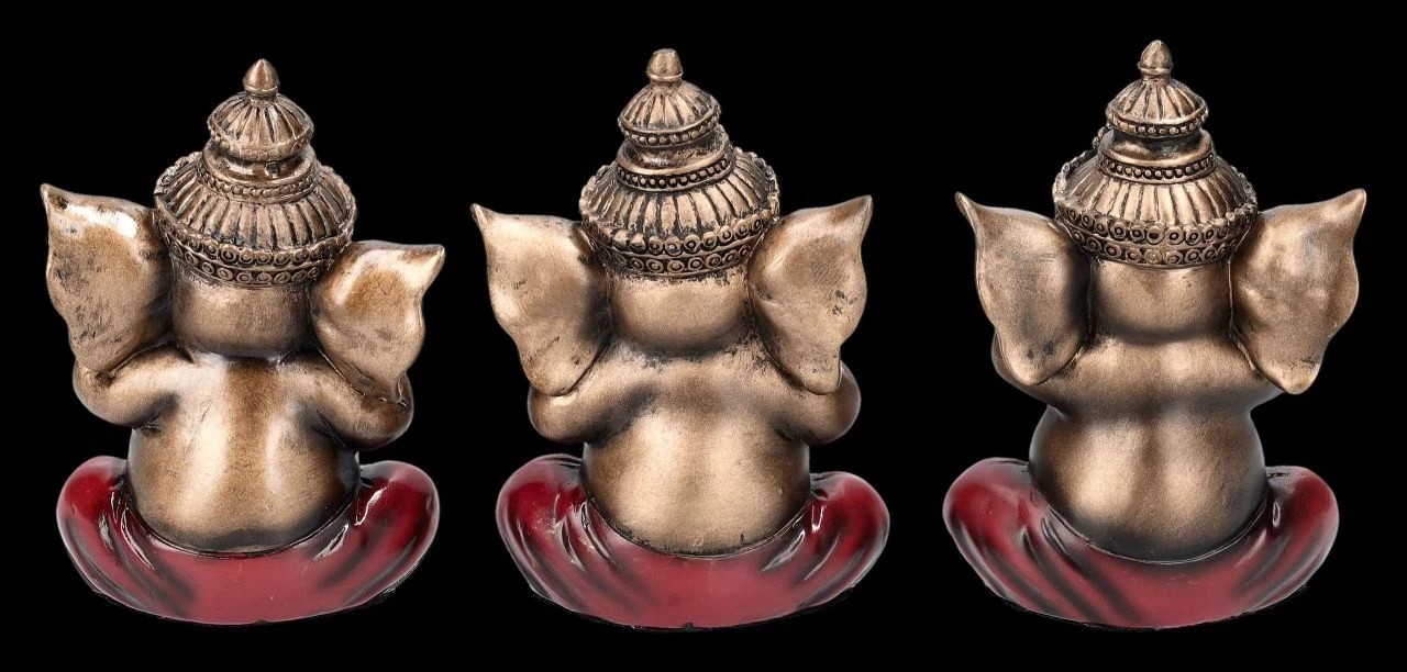 Dass der elefantenköpfigen Hindu-Gott Ganesha auch für eine lebenspraktische Weisheit sehr beliebt ist, wird hier wunderbar dargestellt. Denn vermutlich ist es manchmal auch weise, wenn man demonstrativ zeigt, dass man nichts Böses hören, sehen und schon gar nicht sagen möchte. Die Ganesha-Figuren in dem Set ‚Nichts Böses‘ wurden aus handbemaltem Kunststein (Polyresin) gefertigt. Sie sind je 9,5 cm hoch, je 7 cm breit und je 4,5 cm tief und passen als Zeichen der Klugheit daher auch perfekt auf jeden Schreibtisch.