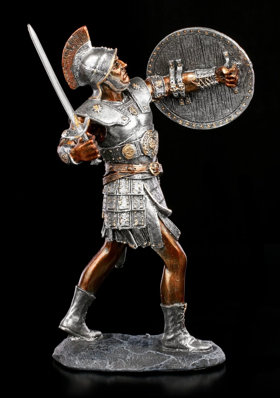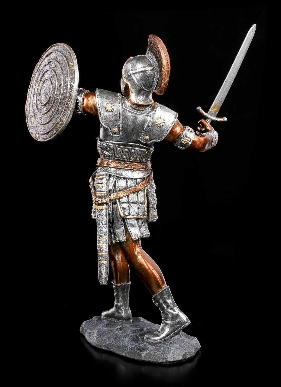 Holen Sie sich die aufregende Atmosphäre eines altrömischen Gladiatorkampfes nach Hause. Der tapfere Gladiator hebt zur Abwehr sein Schild, aber gleich geht er wieder zum Angriff über.