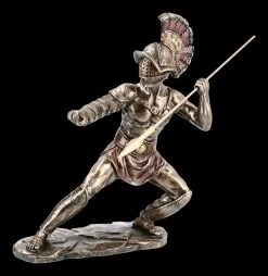 Murmillo war ein schwer bewaffneter römischer Gladiator. Seine Rüstung bestand immer aus einem Arm- und Handschutz auf der rechten Seite, dem Schild der römischen Legionäre, Beinschienen und einem Helm. Als Gewand diente ein Lendenschurtz mit Gürtel. Diese detailgetreue Darstellung des Murmillo mit Speer ist aus dem Haus Veronese und gehört zur Studio Collection. Die fantastische und detailreiche Figur ist aus edel bronziertem und coloriertem Kunststein (Polyresin) gefertigt und ein Blickfang auf jedem Sideboard. Der Speer ist zum Stecken.