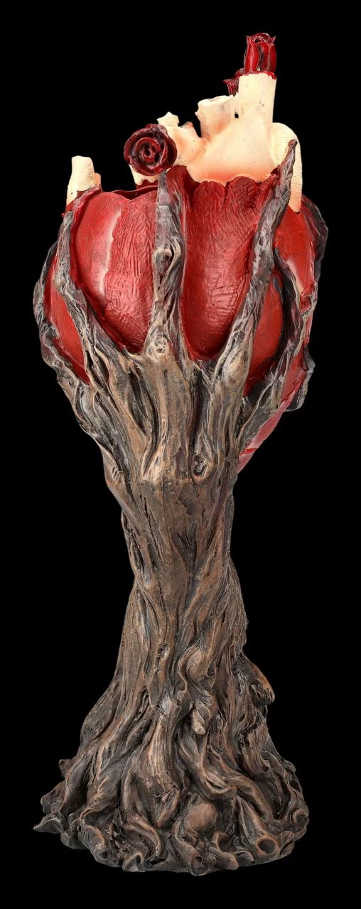 Auch wenn der Gesichtsausdruck dieses wie aus einer uralten Wurzel blickenden Greenman eher ernst wirkt, zeigt er er doch, dass er als als einer der Vegetationsgötter das pulsierende Leben in den Händen hält. Denn mit seinen nach oben gestreckten Händen hält er fest ein blutrotes Herz umschlungen. Schließlich ist der Greenman ein Symbol für Sterben und Wiedergeburt, aber er schützt auch das Entstehen und Vergehen der gesamten Natur. Mit der Höhe von 33,5 cm, der Breite von 14 cm und der Tiefe von 12 cm ist die sorgfältig und detailreich aus handbemaltem Kunststein (Polyresin) gefertigte Greenman Figur mit dem roten Herzen eine sehr faszinierende Deko und auch ein tolles Geschenk.