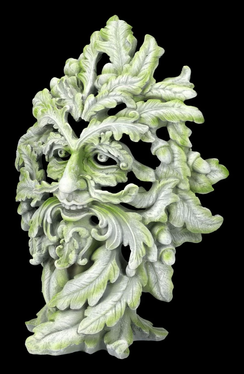 Dieser mystische Baumgeist von Andrew Bill wirkt wie eine bereits mit Grünalgen überzogene uralte Darstellung eines Greenman. Beinahe so findet man sie auf manchen Kirchen, die den Naturgeist aus heidnischen Zeiten als Schmuck übernommen hatten. Der Bildhauer und Künstler Andrew Bill aus Staffordshire liebt die Kunst der Fantasie und das ist auch bei seiner Greenman-Skulptur ‚Forest Ancient‘ zu sehen. Erst auf den zweiten Blick entdeckt man zwischen den Blätttern die klugen Augen und den Mund des Baumgeistes. Die 29 cm hohe, 21,5 cm breite und 13 cm tiefe Skulptur mit den vielen Details wurde aus hochwertigem Kunststein (Polyresin) gefertigt und von Hand bemalt. Diese Beumgeist-Statue von Andrew Bill wird in jedem Ambiente zum sofortigen Blickfang.