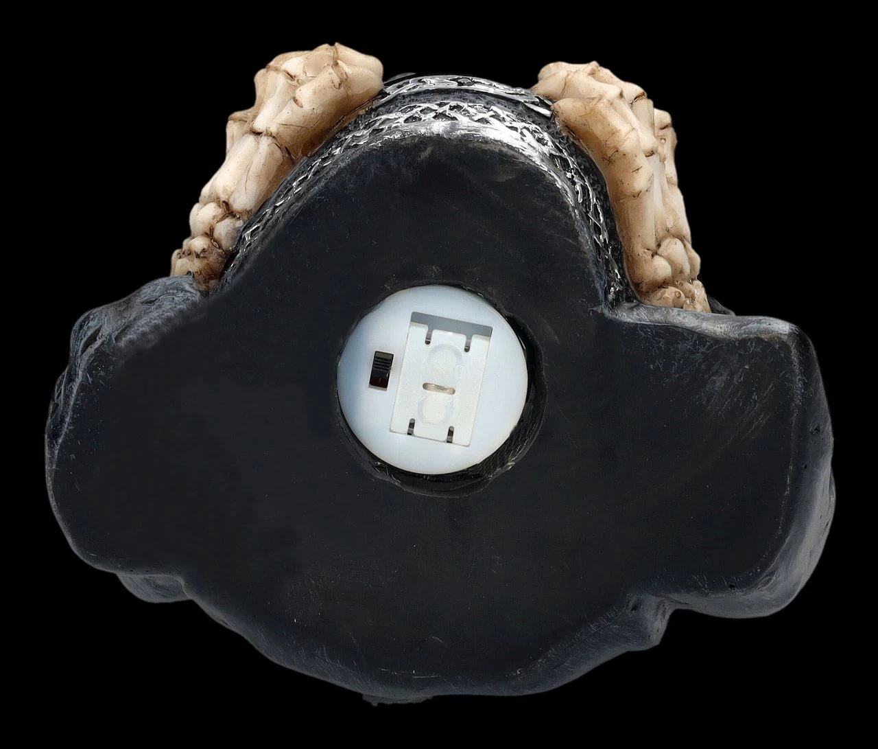 Kalte Schauer laufen sicher jedem über den Rücken, der diesen gruselig grinsenden Grim Reaper sieht, der die Lampe mit dem Lebenslicht in seinen knochigen Händen hält. Durch die batteriebetriebene LED-Beleuchtung mit Farbwechsler in der Glaslampe bekommt die 21,5 cm hohe, 14 cm breite und 11 cm tiefe Grim Reaper Büste aus handbemaltem Kunststein (Polyresin) einen zusätzlichen Gruseleffekt. Diese Sensenmann-Figur ‚Dein Ende naht‘ ist nicht nur für Halloween eine schauerliche Deko. Für die LED-Beleuchtung werden 3 x LR41 Batterien benötigt, die nicht in der Lieferung enthalten sind.