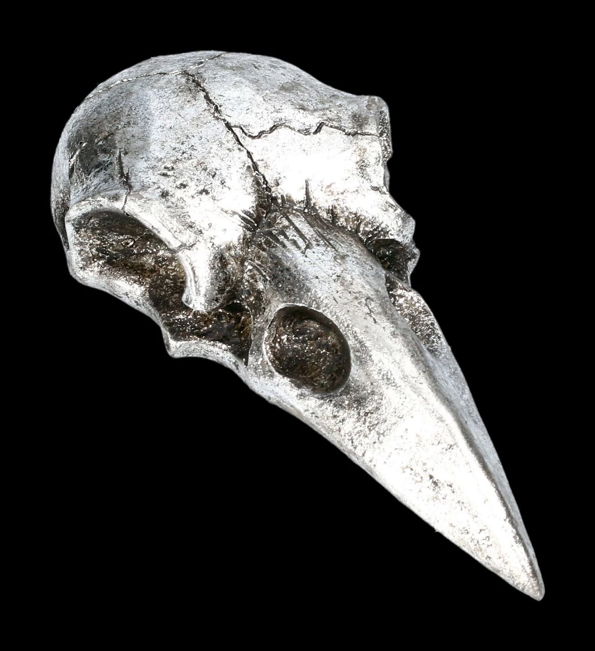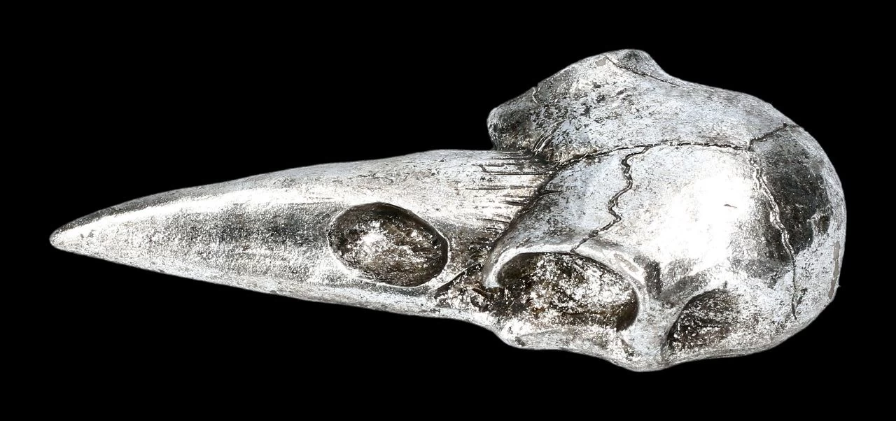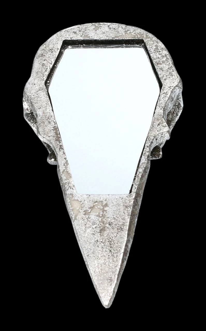 Ein mystisches Accessoire nicht nur für Seher, Magier und Hexen ist dieser silberfarbene Handspiegel mit dem Rabenschädel aus der Serie ‚Alchemy The Vault‘ von Alchemy England. Er ist detailliert aus Kunststein (Polyresin) gefertigt und sorgsam handbemalt. Der silberfarbene Handspiegel mit dem Rabenschädel sieht faszinierend aus. Er ist 15 cm hoch, 7 cm breit und 3 cm tief und hat eine Spiegelfläche mit 8,5 x 5 cm.