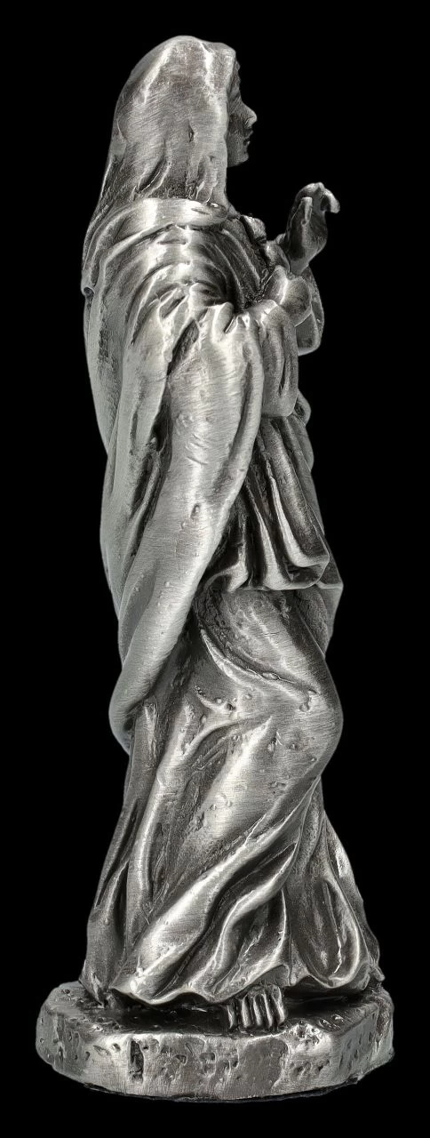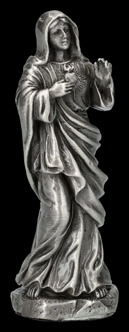 Sanft lächelnd, die rechte Hand zum Herzen weisend und die linke Hand segnend erhoben, ist diese handbemalte Heiligen Figur, die Maria mit dem sichtbaren Herzen zeigt, sorgfältig aus Zinn gefertigt. Die schöne Heiligen-Figur, die beinahe wie eine Figur aus dem Mittelalter wirkt, ist 10,5 cm hoch, 3,5 cm breit und 3,5 cm tief. Das ‚Unbefleckte Herz Mariä‘ wird in der katholischen Kirche nach Pfingsten, nach dem Fest ‚Heiligstes Herz Jesu‘, gefeiert und gehört heute zur römisch-katholischen Spiritualität. Als Zeichen der Hoffnung und Liebe ist diese schöne Zinn-Figur ‚Unbeflecktes Herz Mariä‘ auch ein wunderbares Geschenk.