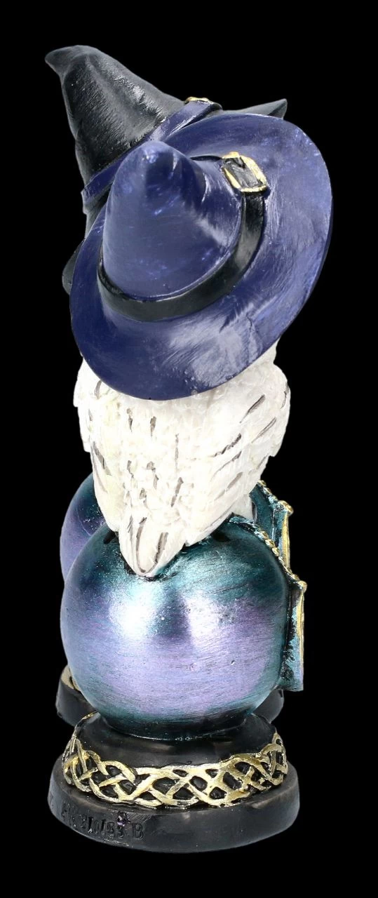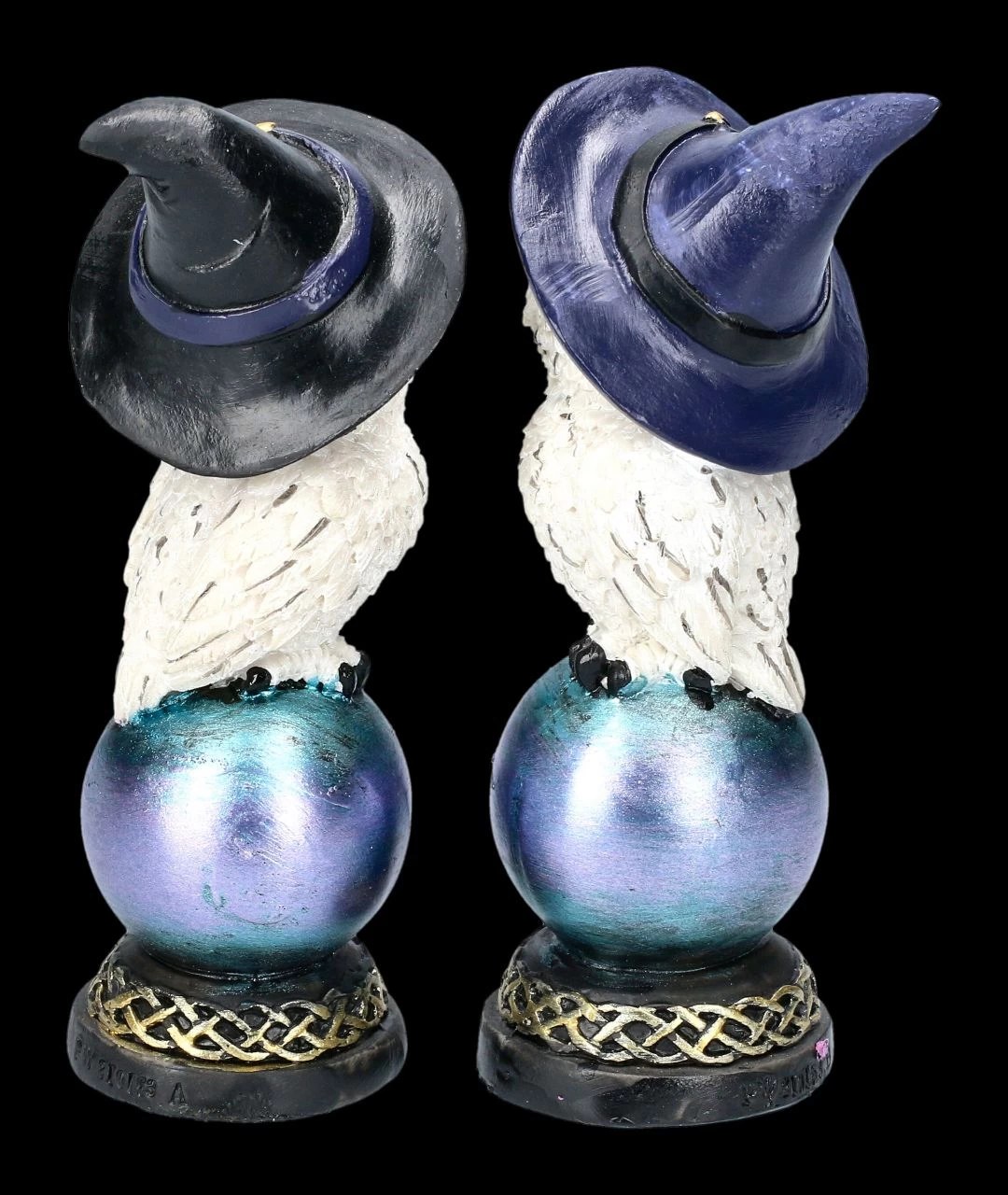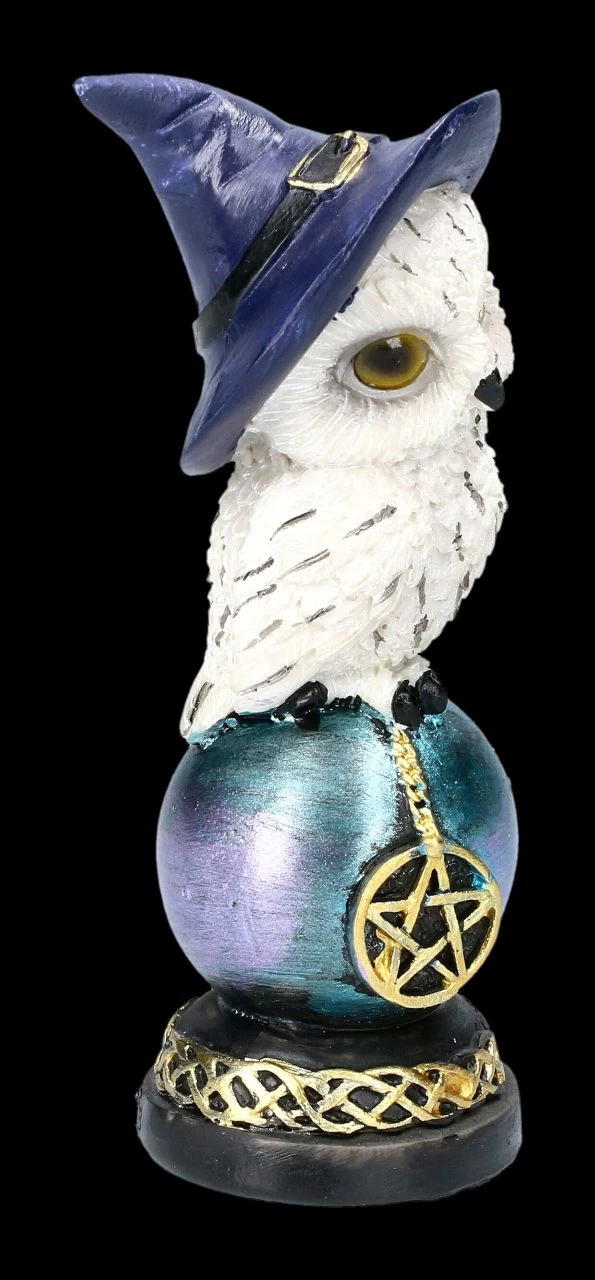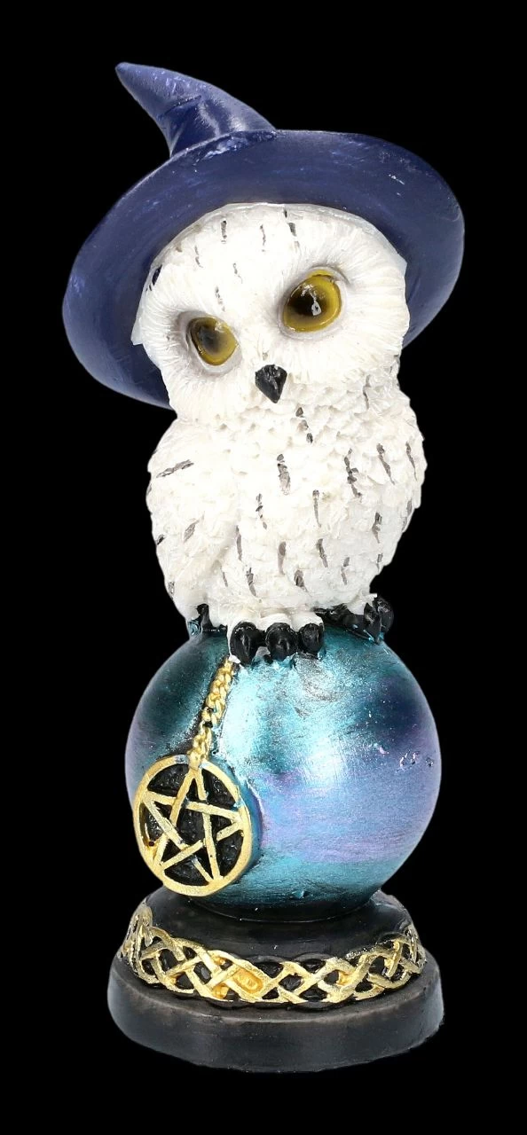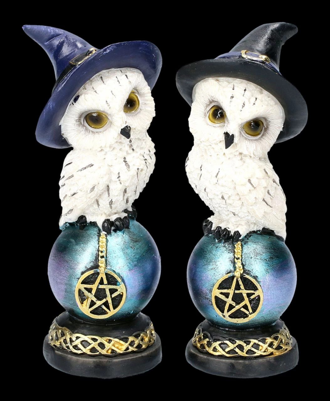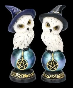 Wären die Hexenhüte nicht zu sehen, würde man bei dem unschuldigen Blick dieser beiden niedlichen Schneeeulen, die auf einer mit Pentagramm verzierten Kugel Platz genommen haben, wohl nicht vermuten, dass es sich um Hexen-Eulen handelt. Die Kugeln ruhen auf einem Sockel, der mit einer keltischen Bordüre verziert ist. Die 13 cm hohen, 4,5 cm breiten und 4,5 cm tiefen Eulenfiguren im 2er Set sind liebevoll aus handbemaltem Kunststein (Polyresin) gefertigt. Sie sind eine hübsche Deko, aber auch – nicht nur für Hexen oder Eulen-Fans – ein bezauberndes Geschenk.