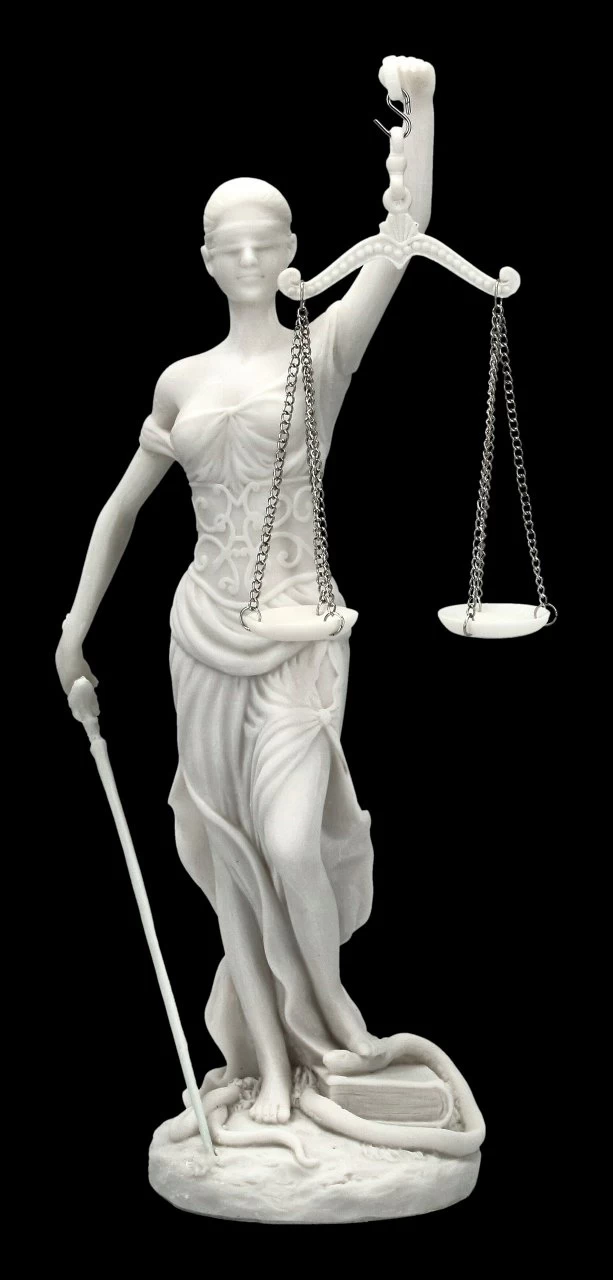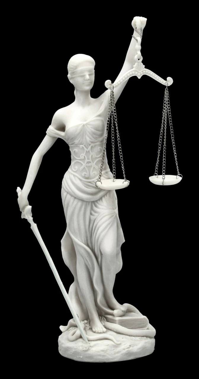 Römische Göttin der Gerechtigkeit. Im Griechischen genannt Dike. Darstellung mit Waage (Abwägen der Sachlage), dem Richtschwert (durchführen der Entscheidung) und der Augenbinde (Unvoreingenommenheit)
