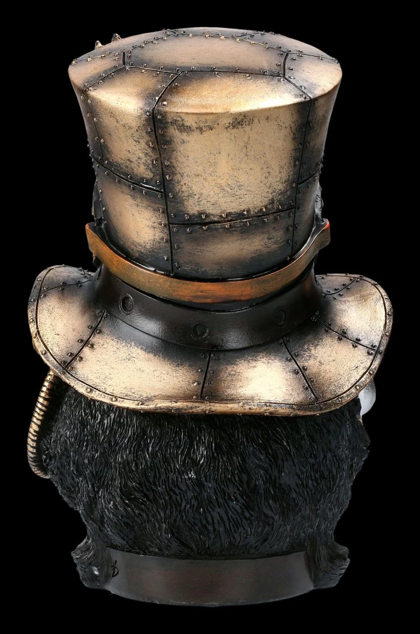 Diese Figur wird jeden begeistern. Vorsicht! Ein magischer Blick aus hypnotisch grünen Augen trifft Sie, wenn Sie diese außergewöhniche Steampunk Büste des Felius Mogg betrachten. Die schwarze Steampunk Katze mit Hut ist faszinierend detailreich aus von Hand bemaltem Kunststein (Polyresin) gefertigt. Die vielen technischen Details der 21 cm hohen, 16 cm breiten und 15 cm tiefen Steampunk Büste wirken wie aus Metall gefertigt. Felius Mogg ist nicht nur für Steampunk Fans, sondern auch für Katzenfreunde ein ganz besonders ausgefallenes Geschenk.
