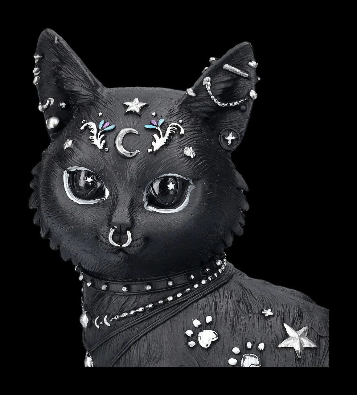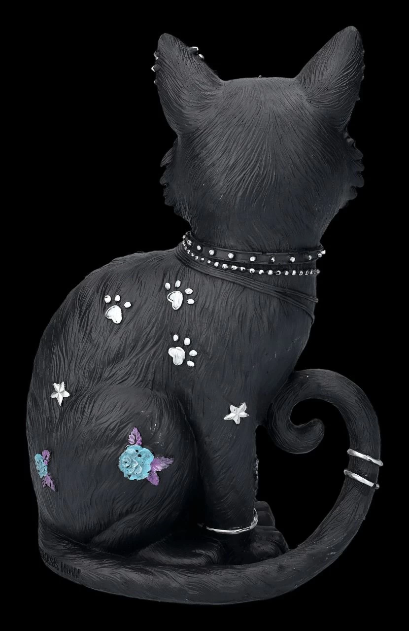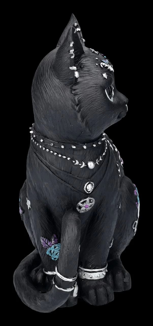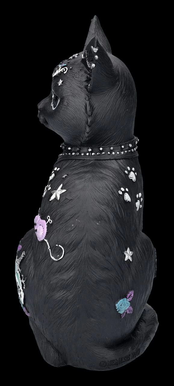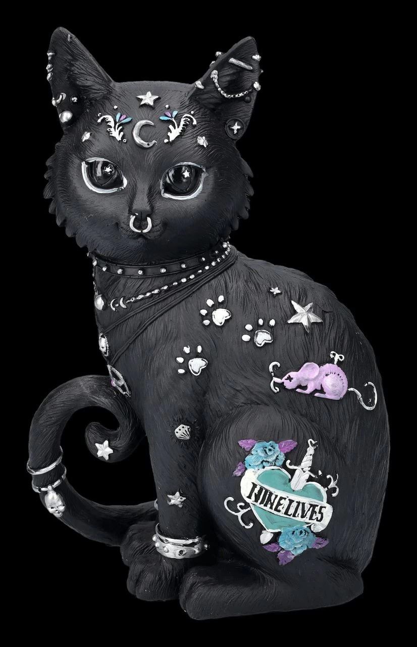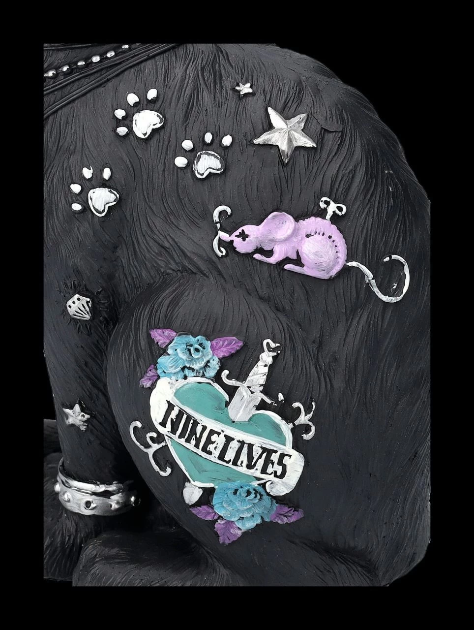 Sieben oder neun Leben, das ist hier die Frage. Die schwarze Katze hat sich für neun Leben entschieden und sich das auch – neben vielen magischen Symbolen – tätowieren lassen. Ein blaues, mit einem Schwert durchbohrtes Herz trägt eine Banderole mit der Aufschrift ‚Nine Lives‘. Na, wenn das nicht hilft! Die schwarze Katze mit den Tattoos ist 22 cm hoch, 13,5 cm breit und 9 cm tief. Sie wurde aus detailreich handbemaltem Kunststein (Polyresin) gegossen und ist für alle Hexen und Magier ein wunderbares Geschenk.