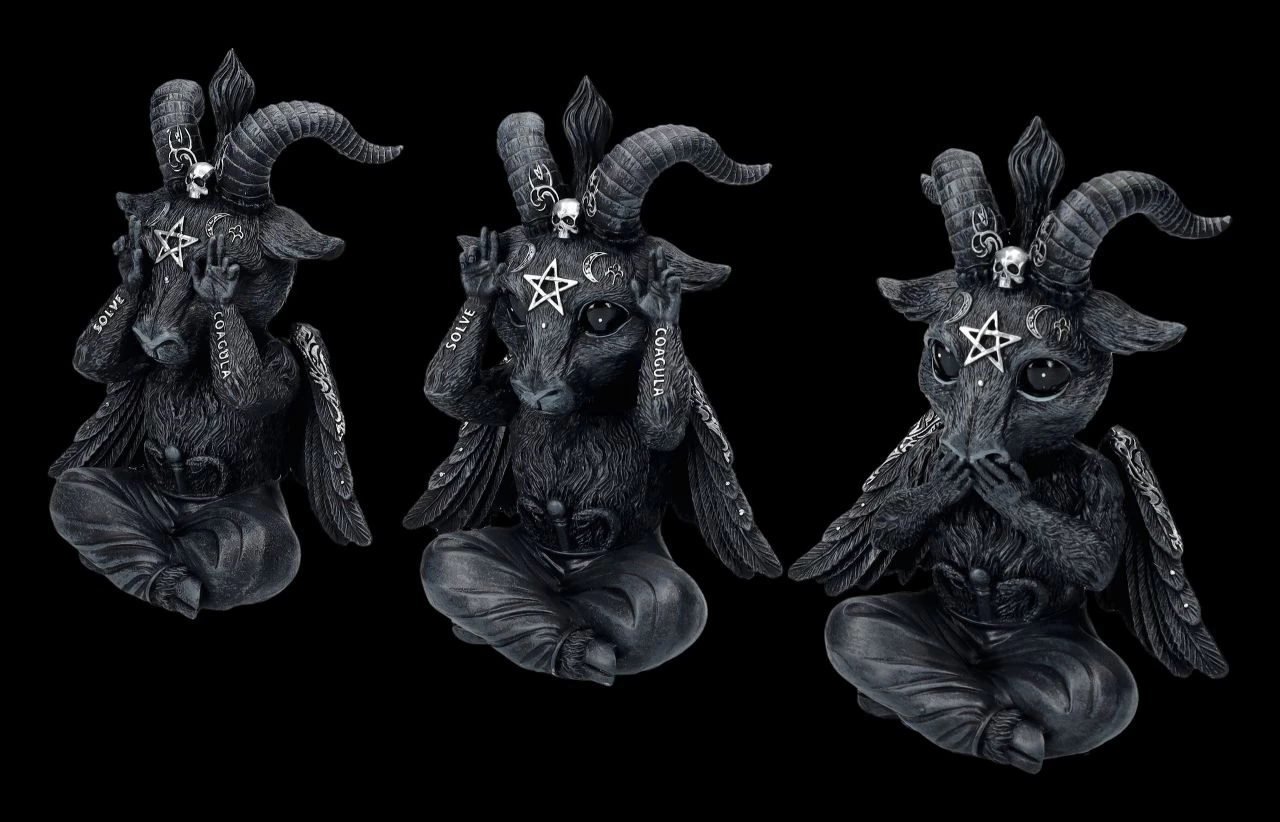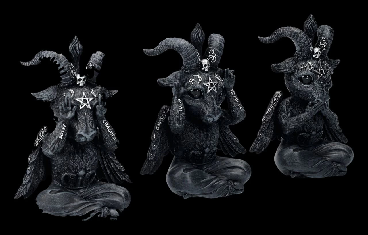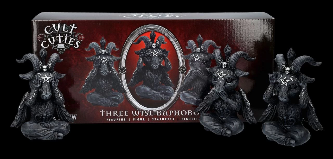 Irgendwie scheinen sie einen leicht verzweifelten Eindruck zu machen…. Aber kein Wunder, auch die kleinen Baphomets wollen nichts Böses sehen, hören und sagen. Die witzigen, je 13 cm hohen, je 10 cm breiten und je 5,5 cm tiefen Baphoboo Figuren aus der Cult Cuties Serie von Nemesis Now wurden sorgfältig aus handbemaltem Kunststein (Polyresin) gefertigt. Sie werden zum Hingucker auf jedem Schreibtisch, sind aber auch ein vielsagendes Geschenk und werden inklusive eines toll bedruckten Geschenkkartons verschickt.