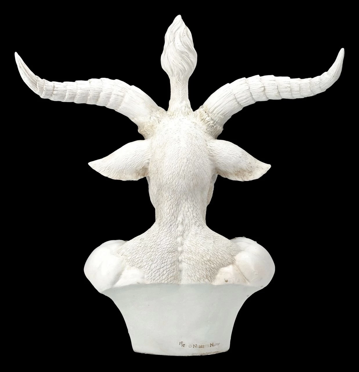 Faszinierend und edel ist diese weiße Büste des Baphomet mit den wenigen goldenen Akzenten in den zahlreichen Symbolen.‘ Löse und verbinde‘ – also füge es zu einem anderen Ganzen wieder zusammen – bedeutet die alchemistische Formel ‚Solve et coagula‘ über den Freimaurer-Symbolen auf der Brust der okkulten Baphomet-Figur mit dem Pentagramm auf der Stirn. Aber auch die Symbole der Zwillingsbrüder Cautes und Cautopates aus dem Mitraskult, wie der Morgen durch die Sonne und der Abend durch den Mond auf den Schulterblättern der Baphomet Büste lassen viele Deutungen zu. Schließlich vereint Baphomet Frau und Mann, Gut und Böse, Mensch und Dämon, Mensch und Tier. So ist es nicht verwunderlich, dass die Symbole aus allen alten Kulturen bekannt sind. Die schöne Baphomet Büste von Nemesis Now aus handbemaltem und detailreich gefertigtem Kunststein (Polyresin) mit der Höhe von 34 cm, der Breite von 30,5 cm und der Tiefe von 15 cm ist in ihrer zurückhaltenden Form- und Farbgebung ein magischer Blickfang