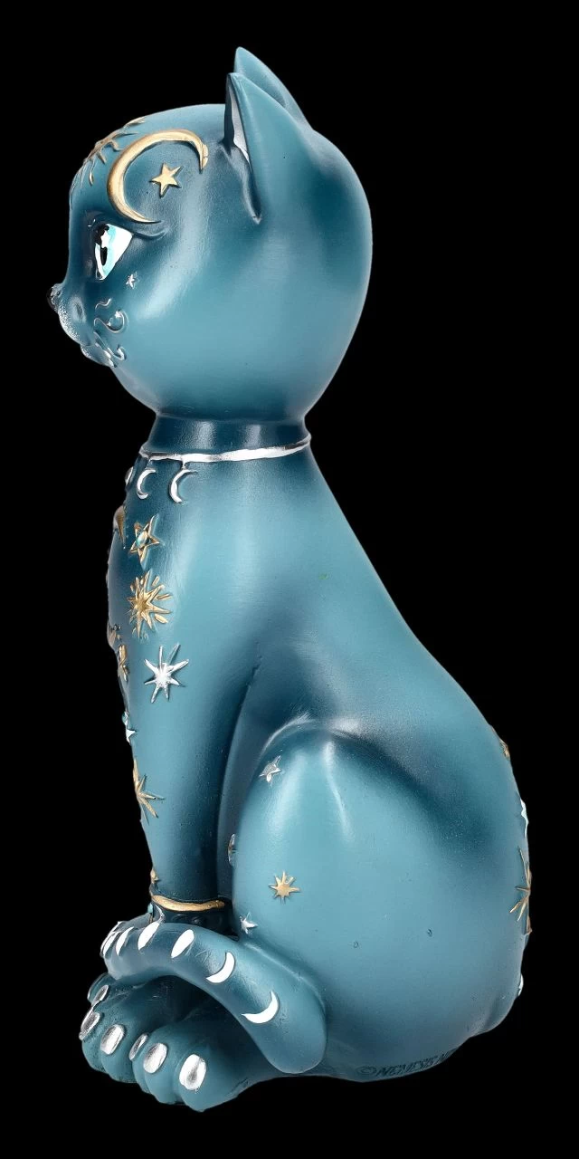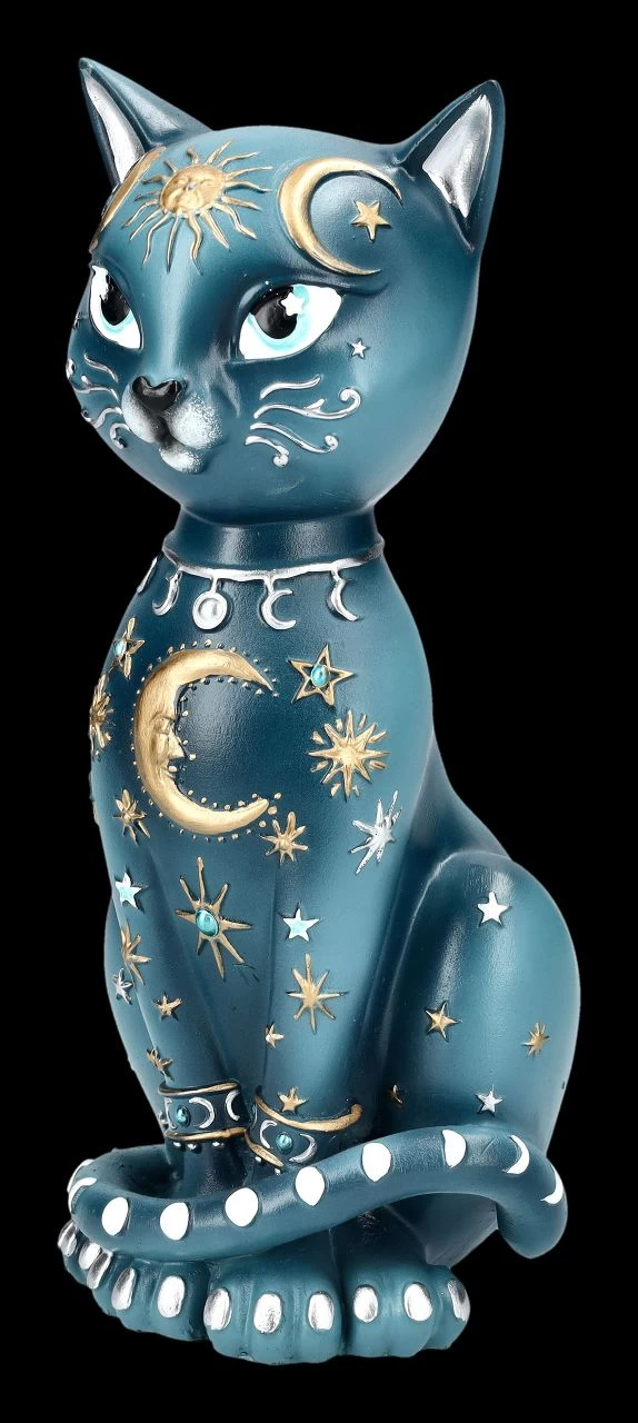 Katzen sind magische und eigenwillige Tiere, das wird jeder bestätigen der eine Katze als Mitbewohner hat. Und sie stehen auch gerne im Mittelpunkt, wie diese mit Sonne, Mond und Sternen verzierte Celestial Kitty. Die himmlische schwarze Katzenfigur mit den goldenen und silbernen Symbolen ist mit der Höhe von 26 cm, der Breite von 10,5 cm und der Tiefe von 11 cm garantiert nicht zu übersehen. Sie wurde aus liebevoll handbemaltem Kunststein (Polyresin) gefertigt und ist ein wunderbares Geschenk für jeden, der Katzen bewundert.